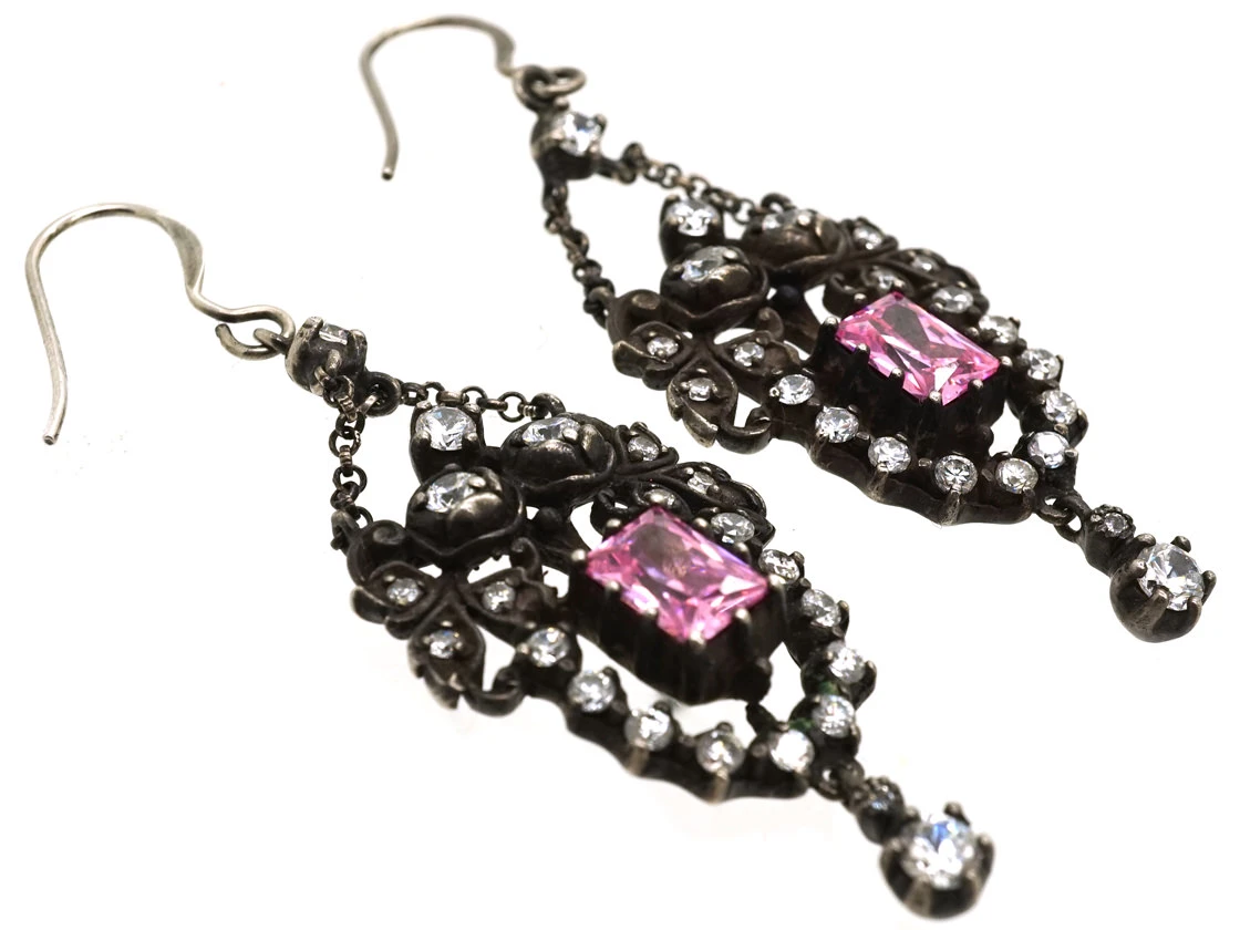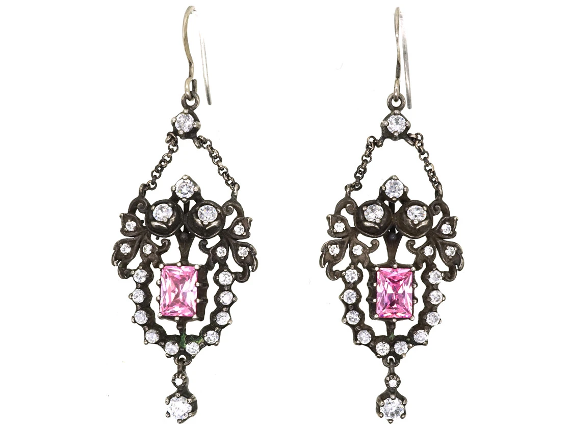 drop earrings set with pink and white pasteGlass made to resemble gem materials, which may be moulded, faceted, carved, etc. . The Edwardians loved this combination of pink and white as it went so well with the fashions of the period.There is a pendant to match in the “Pendants” section.