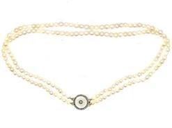 A pretty choker that was made circa 1910. It consists of two strands of graduated cultured pearls with a round 15ct62.5% pure gold (or 625 parts pure gold and 375 parts other metals). Popular during the Victorian, Edwardian and Art Deco eras but was discontinued in the mid-1930s. gold clasp set with diamonds and pale creamy blue guillochè enamelA pigmented glass-like material used in powdered form and fused onto the metal surface of a piece of jewellery.. It has a Russian look about it.