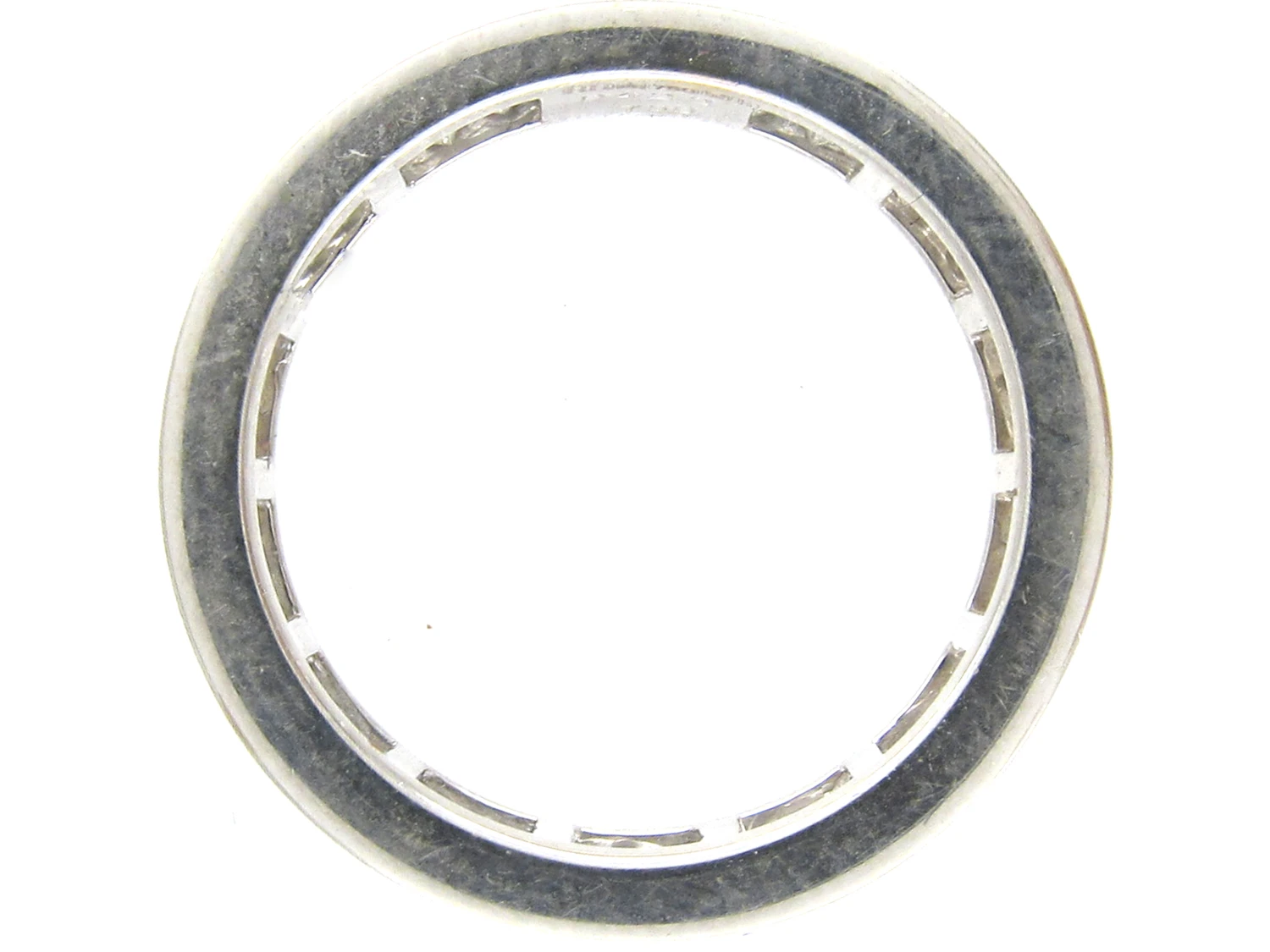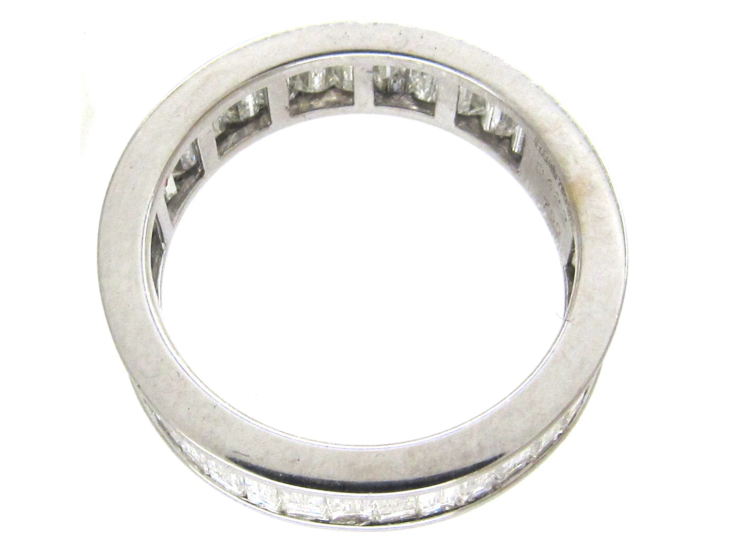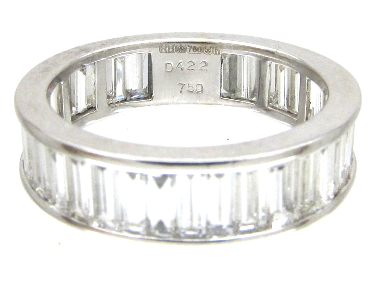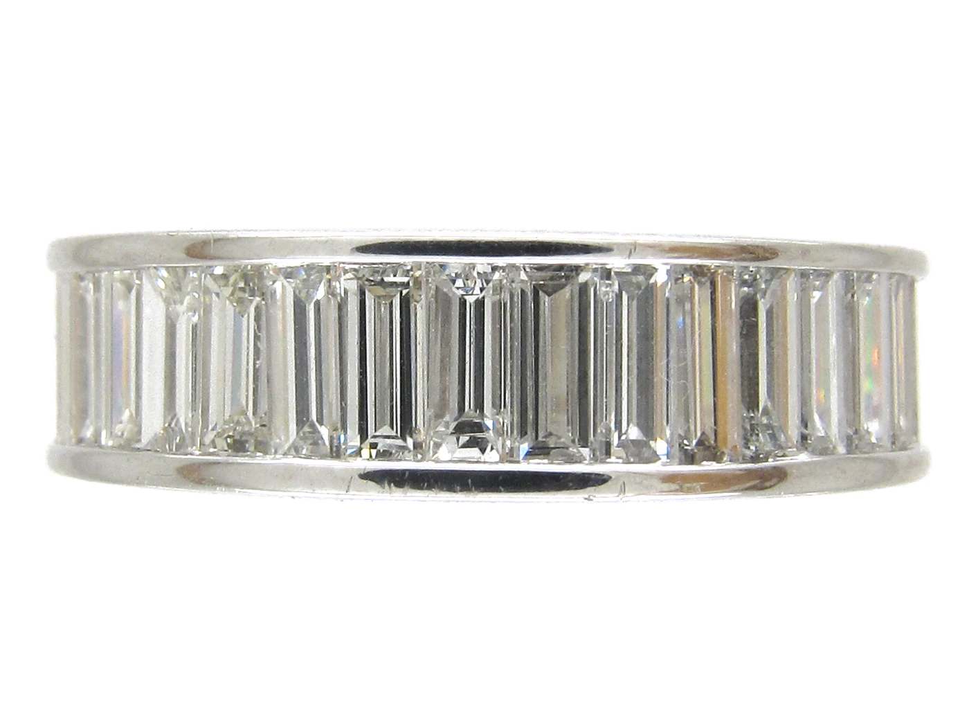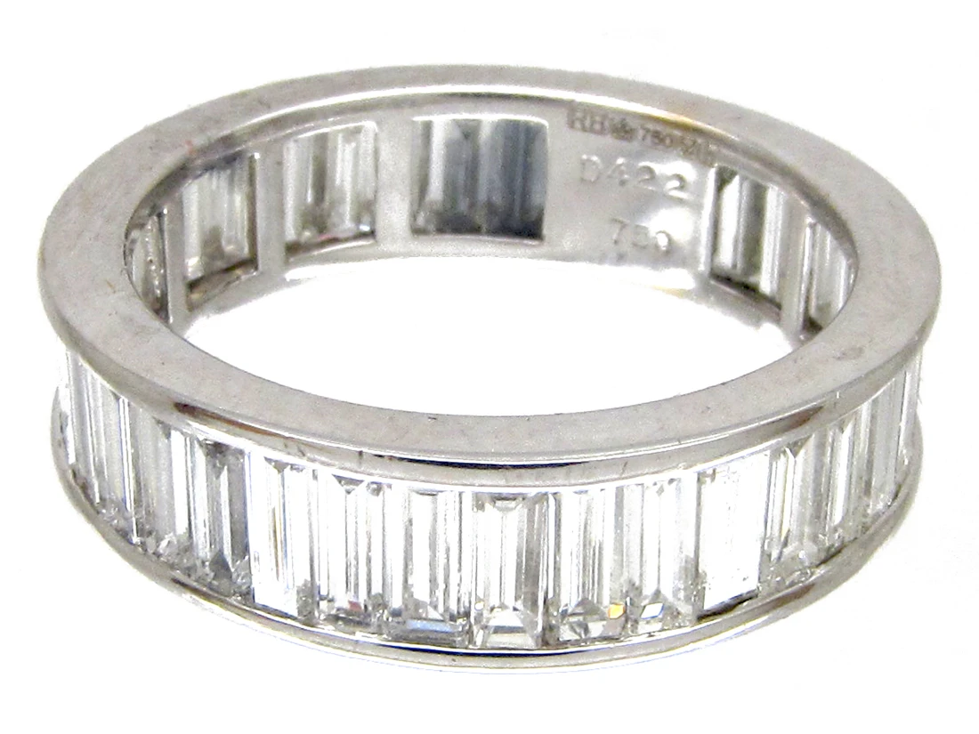 set with even coloured baguetteFrench for ârod.â A type of rectangular step-cut comprising fourteen parallel, narrow facets running the length of the stone. Popular in mid-century eternity bands. diamonds. The total weight is 4.22 caratsThe unit of weight for a diamond or other gemstone and also for a pearl. Abbreviated ‘ct’, 1 carat is equal to 0.2 grams. In reference to gold, a unit of purity or fineness of gold and gold alloy, expressed as a number out of 24 parts by weight, e.g. ’24 carat’ signifies pure gold, ’18 carat’ 18/24th gold in the alloy, et cetera. Also abbreviated as ‘c… which is engraved inside the shankThe circle of metal that attaches to the decorative part of a ring and encircles the finger..