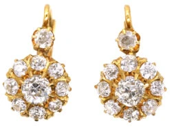 A beautifully presented pair of French 18ct75% pure gold (or 750 parts pure gold and 250 parts other metals) gold earrings in their original case. They are set with old mine cutAn 18th, 19th and early 20th century diamond shape, typically cushion or asymmetrical, marked by a small table, a high crown and a large culet. Culets are the small flat facets at the bottom of a stone which appear to the untrained eye as a hole in the middle of the stone. Before the advent of modern machinery which allows for the precise faceting we see tod… diamonds and have hinge back fittings which are comfortable and safe to wear. They are in mint condition.