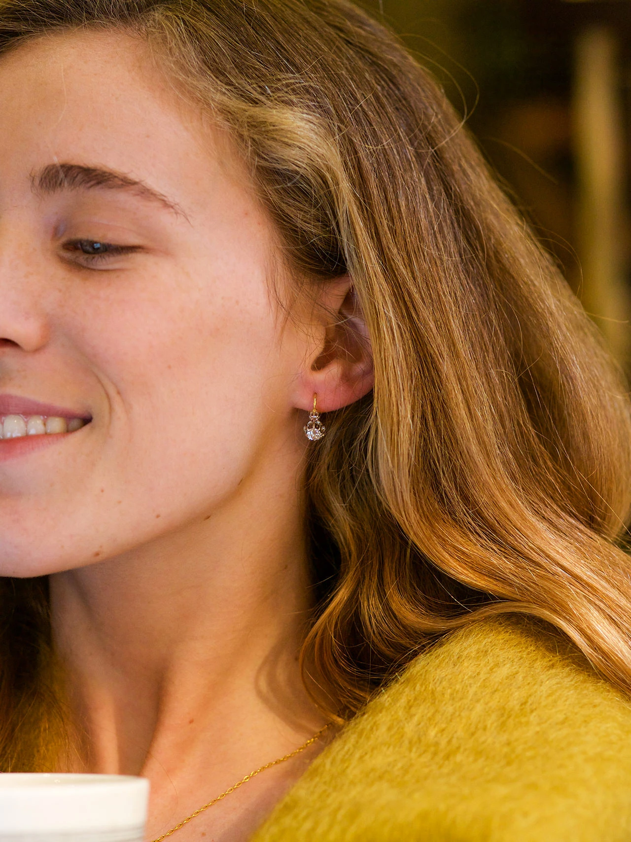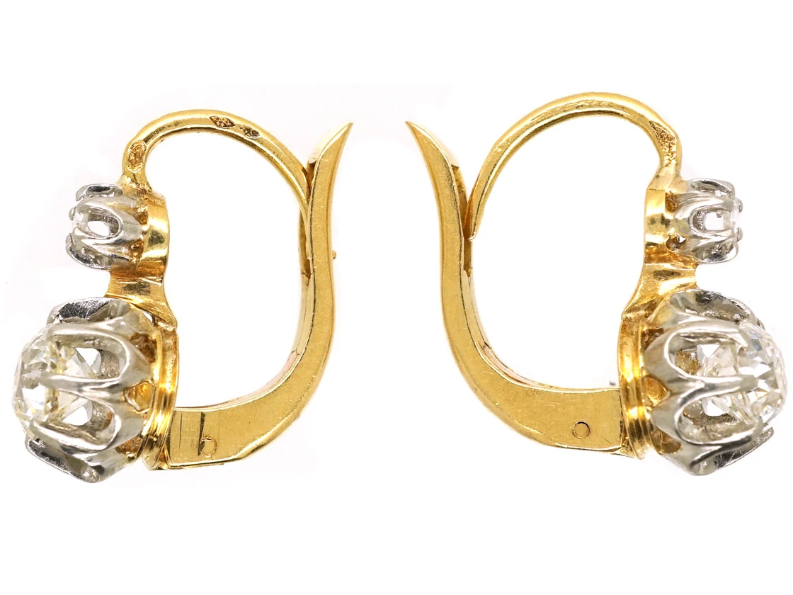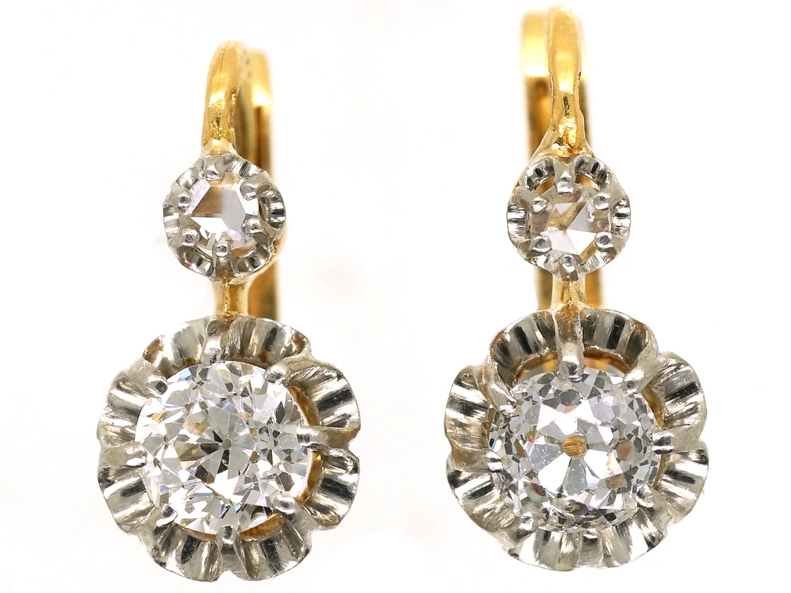 A lovely neat pair of diamondA precious, lustrous gemstone made of highly compressed carbon. Diamonds are one of the hardest materials known to mankind. Colours of diamonds range from colourless, yellow, orange and brown to almost black. Natural coloured (or ‘fancy’) diamonds can be extremely rare. The cut, colour, clarity and carat weight of a diamond are the criteria jewellers use… earrings. They were made in France circa 1910-1920. The diamonds are 40 pointsA unit of weight for a diamond, being one-hundredth of a metric carat. It is used for weights that are decimal fractions of a carat, and all figures after the second decimal point are, in the diamond and jewellery trade, generally discarded. each, which is over three quarters of a caratThe unit of weight for a diamond or other gemstone and also for a pearl. Abbreviated ‘ct’, 1 carat is equal to 0.2 grams. In reference to gold, a unit of purity or fineness of gold and gold alloy, expressed as a number out of 24 parts by weight, e.g. ’24 carat’ signifies pure gold, ’18 carat’ 18/24th gold in the alloy, et cetera. Also abbreviated as ‘c…. This style is easy to wear and ideal for any occasion.