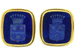 A very smart pair of 18ct75% pure gold (or 750 parts pure gold and 250 parts other metals) gold cufflinks. Each one has been set with a rectangular plaque of naturalA natural stone is called such because it has not been subjected to any treatments. lapis lazuliAn historically popular deep blue opaque gemstone. Lapis Lazuli is chiefly composed of the mineral Lazurite and is often flecked with gold Pyrite, giving each stone a unique mysticism..They originally belonged to a French marquis as the coronet above the shield with three florets within informs us. They are well made and in excellent condition.