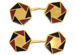 A wonderful pair of Art DecoA movement within the arts between the two Great Wars (1920-1935) across Europe and the US, characterized by its clean, geometric designs. The aesthetic was intended to celebrate an age of progress and the modernity of the machine. cufflinks that were made in France in the 1920s. They are typical of the period with slightly raised black enamelA pigmented glass-like material used in powdered form and fused onto the metal surface of a piece of jewellery. and burgundy colour enamel with a mottled surface in a continuous triangular design. The French are well known for their amazing workmanship in jewellery, especially in the Art Deco period.