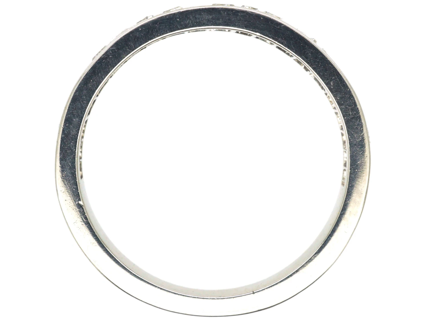 A fabulous platinumDerives from the Spanish word ‘platina’ meaning ‘little silver’. Acknowledged since the 1900s, platinum’s durability and natural brightness has been and still is today highly treasured A metallic element prized for its rarity, whiteness, high tensile strength and insusceptibility to corrosion, platinum first became widely used in jewellery in the late ninete… ring that was made in France in the 1920s. It has been set with one and a half caratsThe unit of weight for a diamond or other gemstone and also for a pearl. Abbreviated ‘ct’, 1 carat is equal to 0.2 grams. In reference to gold, a unit of purity or fineness of gold and gold alloy, expressed as a number out of 24 parts by weight, e.g. ’24 carat’ signifies pure gold, ’18 carat’ 18/24th gold in the alloy, et cetera.Ā Also abbreviated as ‘c… of graded baguetteFrench for ārod.ā A type of rectangular step-cut comprising fourteen parallel, narrow facets running the length of the stone. Popular in mid-century eternity bands. diamonds within a tramline setting. The diamonds are a good even bright white colour. It is a smart and very wearable ring that would suit any occasion and can be worn day and night.