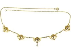 This is such a pretty 18ct75% pure gold (or 750 parts pure gold and 250 parts other metals) gold necklace that is typical of French early 20th century design. There are five stylised garlands of roses with naturalA natural stone is called such because it has not been subjected to any treatments. pearls in between and a natural pearlA pearl-bearing mollusc that has not been tampered with by man to produce a cultivated pearl will produce a ‘natural pearl’. drop. These necklaces were designed to be given as lovers presents or as a wedding gift.