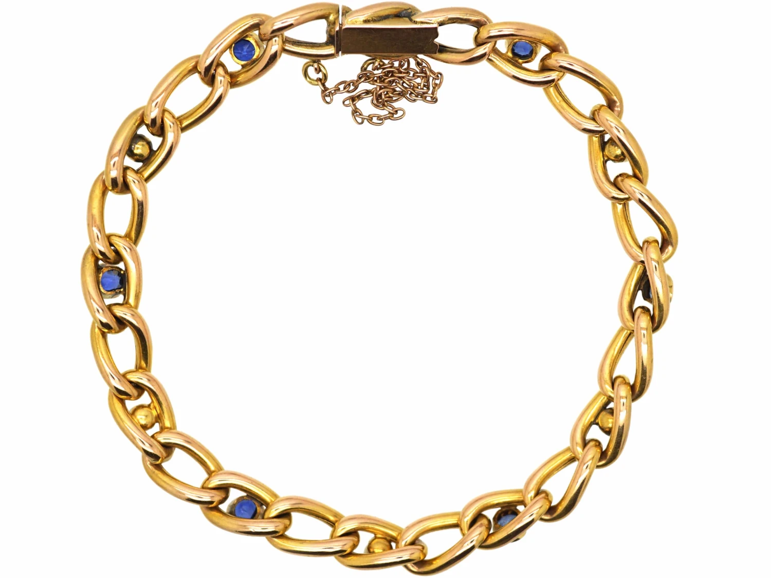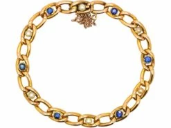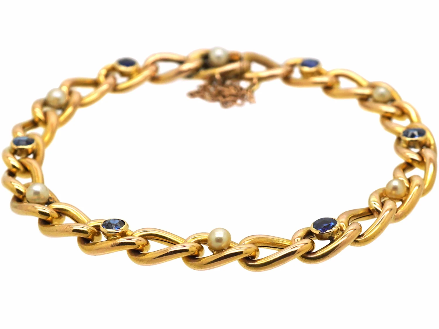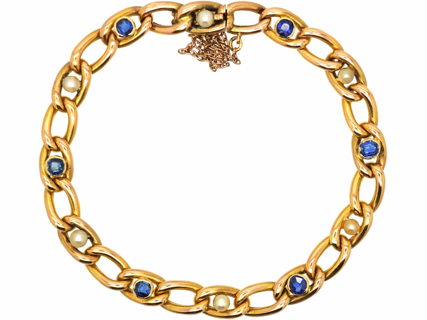 A useful 18ct75% pure gold (or 750 parts pure gold and 250 parts other metals) gold bracelet that was made in France circa 1910. It has been set with six well matched cornflower blue sapphires with six naturalA natural stone is called such because it has not been subjected to any treatments. pearls in between. It is an elongated curb design that looks really smart on the wrist. It has a safety chainA small chain applied to a piece of jewellery with the purpose of adding additional security to prevent loss. On bracelets and necklaces a safety chain will often join the clasp ends should the clasp fail. On a brooch it is often attached to a small pin which is to be used in tandem with the main brooch pin. for extra security.