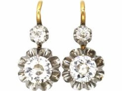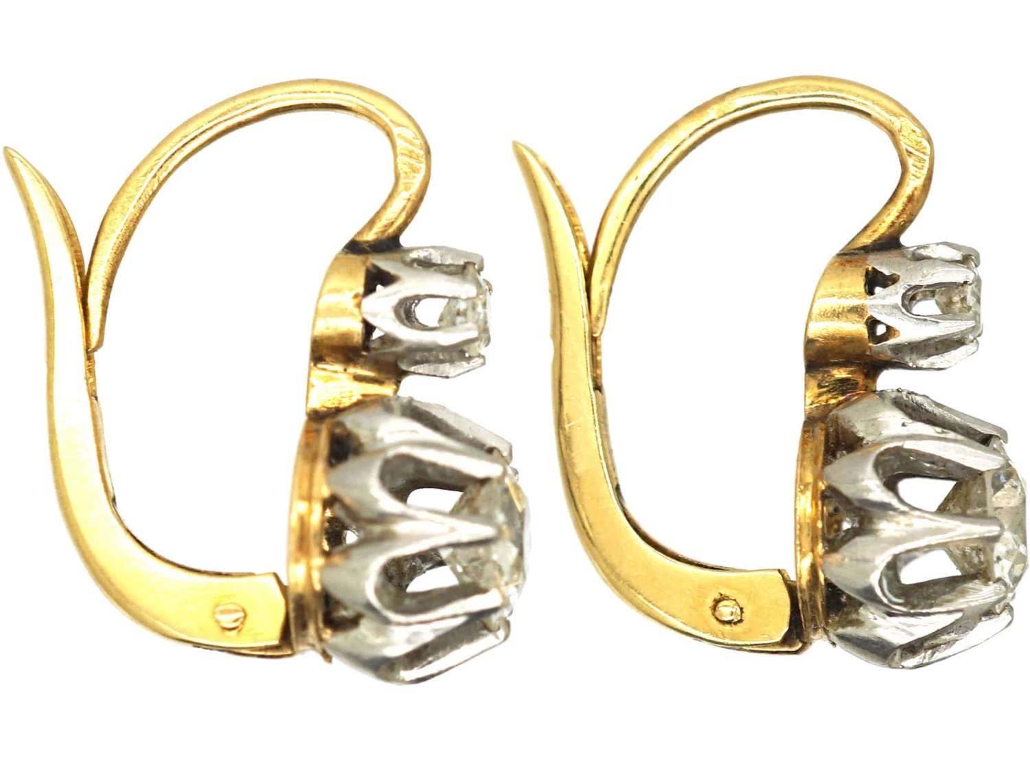 Sleeper or dormeuse earrings started out as single old mine, cushion cutA square or rectangular cut stone with rounded corners. Also called Antique Cut. or rose cutThe ‘rose cut’, defined by its rounded outline and multiple triangular facets, is one of the earliest diamond cuts, with its origins in sixteenth century Europe. A rose cut typically has a flat base and anywhere from six to twenty four facets, the latter known as a full rose cut. diamonds or coloured gemstones in a crown-style setting and were often worn to bed to keep the earlobe hole from closing. These earrings were made in France circa 1900-1910 and are part gold and silverA metallic element which is malleable and ductile, and white in colour, making it ideal for use in jewellery. It is usually mixed with copper to improve its hardness.