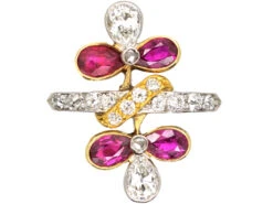 This is a great 18ct75% pure gold (or 750 parts pure gold and 250 parts other metals) gold ring that was made circa 1910 and imported in to France. It is composed of two flowers in a clover design set with pear shaped diamonds and rubies and joined by a gold ribbon set with diamonds above a bandA type of ring which is an equal width all the way round. They are traditionally used for wedding rings.