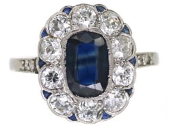 and diamondA precious, lustrous gemstone made of highly compressed carbon. Diamonds are one of the hardest materials known to mankind. Colours of diamonds range from colourless, yellow, orange and brown to almost black. Natural coloured (or ‘fancy’) diamonds can be extremely rare. The cut, colour, clarity and carat weight of a diamond are the criteria jewellers use… ring. It was made in France in the early 1900s and is a fabulous example of fine craftsmanship. The ring is platinumDerives from the Spanish word ‘platina’ meaning ‘little silver’. Acknowledged since the 1900s, platinum’s durability and natural brightness has been and still is today highly treasured A metallic element prized for its rarity, whiteness, high tensile strength and insusceptibility to corrosion, platinum first became widely used in jewellery in the late ninete… and is set with an oval sapphire surrounded by ten well matched white diamonds. There is millgrain decoration around the sapphire and the outer edge. Millgrain decoration is the form of tiny bead shapes that are raised using a knurling tool and which add intricate detail and which give this ring an elegant look. There are also tiny triangular shaped sapphires all around the edge which add extra detail. It is a fine and beautiful ring and would be a lovely engagement ring.