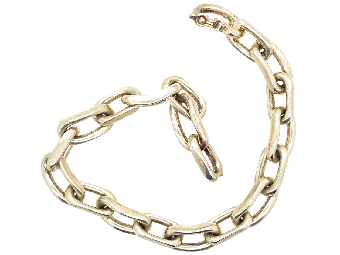 A subtle take on a curb bracelet in that every other link is curved with flat sides and the in between links are oval with flat sides. It is a really good design and feels very good on the wrist. It is French and was made in the 1970s.