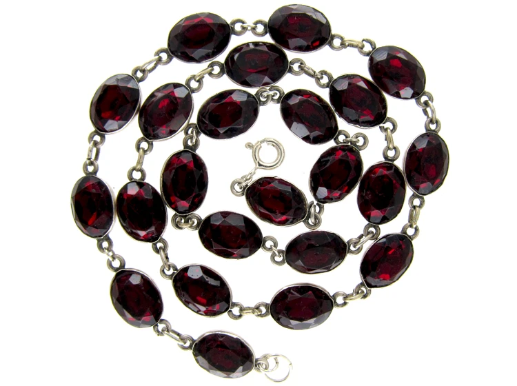 A good rich look, this pasteGlass made to resemble gem materials, which may be moulded, faceted, carved, etc. collar is amazing on the neck. It was the costume jewelleryJewellery designed for wear with current fashions and usually made of inexpensive materials. Usually applied to two classes of jewellery: gem-set imitations, which resemble precious jewellery but are made of silver (sometimes rhodium-coated) or pinchbeck and set with substitutes for gemstones, e.g. marcasite, paste or synthetic gemstones; although usually th… of the day. It was a copy of a garnetDescribes a group of several closely related minerals. Garnets come in a variety of colours, however the most common colour is dark red. In descriptions, ‘garnet’ tends to refer to dark red stones unless otherwise specified. necklace. Made circa 1830 and in good condition for it’s age.