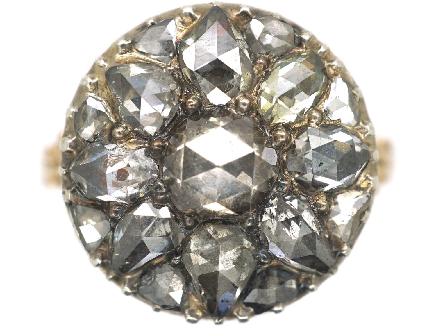 top set with pear shaped diamonds with a round rose diamondA precious, lustrous gemstone made of highly compressed carbon. Diamonds are one of the hardest materials known to mankind. Colours of diamonds range from colourless, yellow, orange and brown to almost black. Natural coloured (or ‘fancy’) diamonds can be extremely rare. The cut, colour, clarity and carat weight of a diamond are the criteria jewellers use… in the centre. The shankThe circle of metal that attaches to the decorative part of a ring and encircles the finger. is 14ct58.5% pure gold (or 585 parts pure gold to 415 parts other metals) gold and has a leaf on either side on a stem forming the shank. Rose diamonds look stunning when worn in a candlelit setting which is precisely why this ring looks so amazing at night and was designed to impress. It is a wonderful ring.