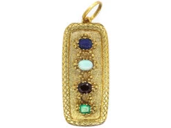 An unusual rectangular shaped locket that opens to reveal a plaited lock of hair. It was made circa 1800-1820 when jewels that sent secret coded messages were popular. This locket spells âLoveâ. Each first letter of each stone is the key. Lapis LazuliAn historically popular deep blue opaque gemstone. Lapis Lazuli is chiefly composed of the mineral Lazurite and is often flecked with gold Pyrite, giving each stone a unique mysticism., OpalOpals occur in a range of body colours from white, black or grey, bright orangey red and a pale watery colour. The most precious opals show strong colour contrast and generally have a dark body colour with a vivid array of colour play., VermeilSterling silver base with a heavy gold plating applied. GarnetDescribes a group of several closely related minerals. Garnets come in a variety of colours, however the most common colour is dark red. In descriptions, âgarnetâ tends to refer to dark red stones unless otherwise specified. & EmeraldOne of the four âpreciousâ stones. An intense, deep green is the most desirable colour for emeralds. Flaws and cloudiness (âjardinâ) are very common in emeralds, so stones are often oiled, irradiated, and dyed to improve their look. Synthetic emeralds have fewer imperfections and are hard to set apart from natural stones. Emeralds belong to the beryl…. It would have been worn to remember someone whose lock of hair it contains. Around the edge is a snake design that further accentuates the message. The snake had become symbolic of the re-birth of the deceased into the next, spiritual life.