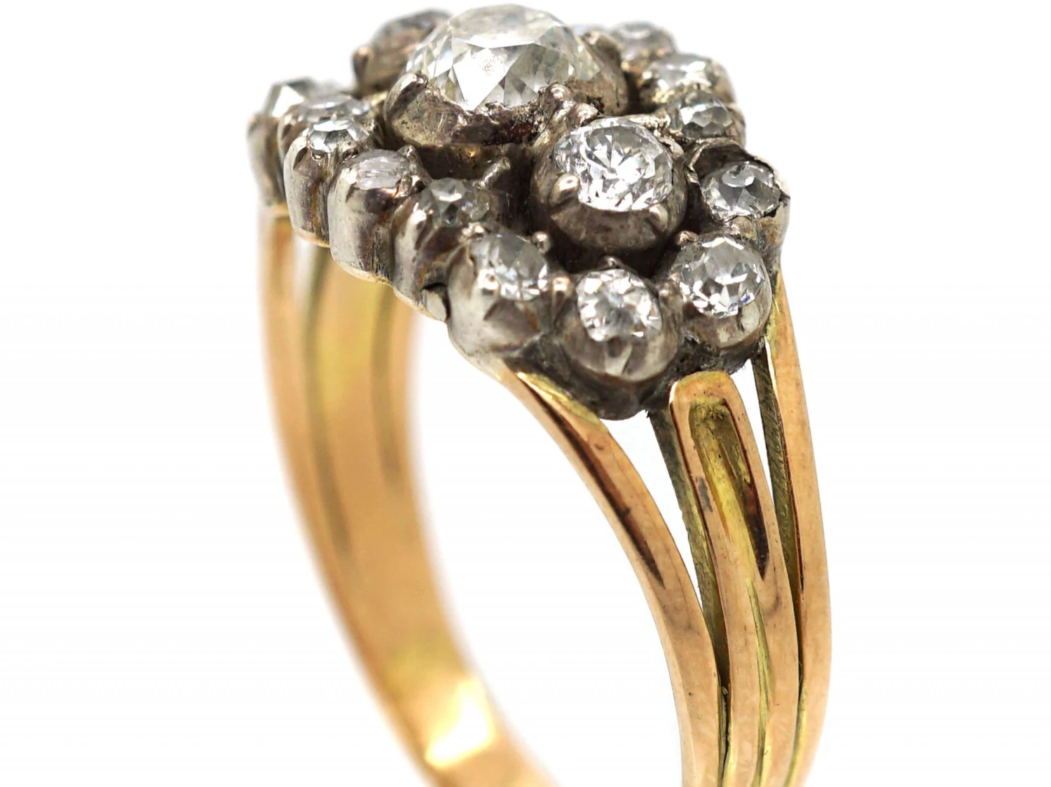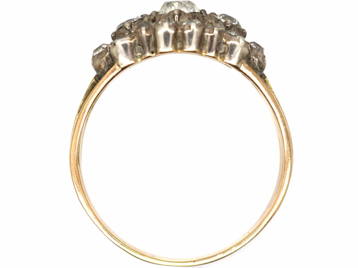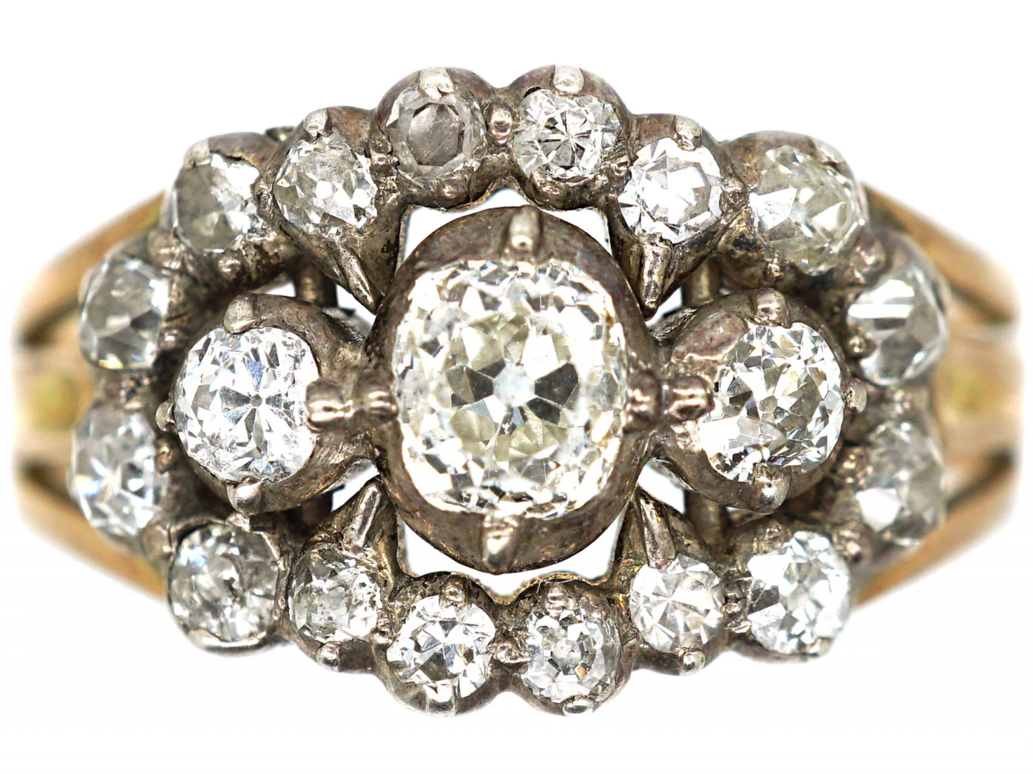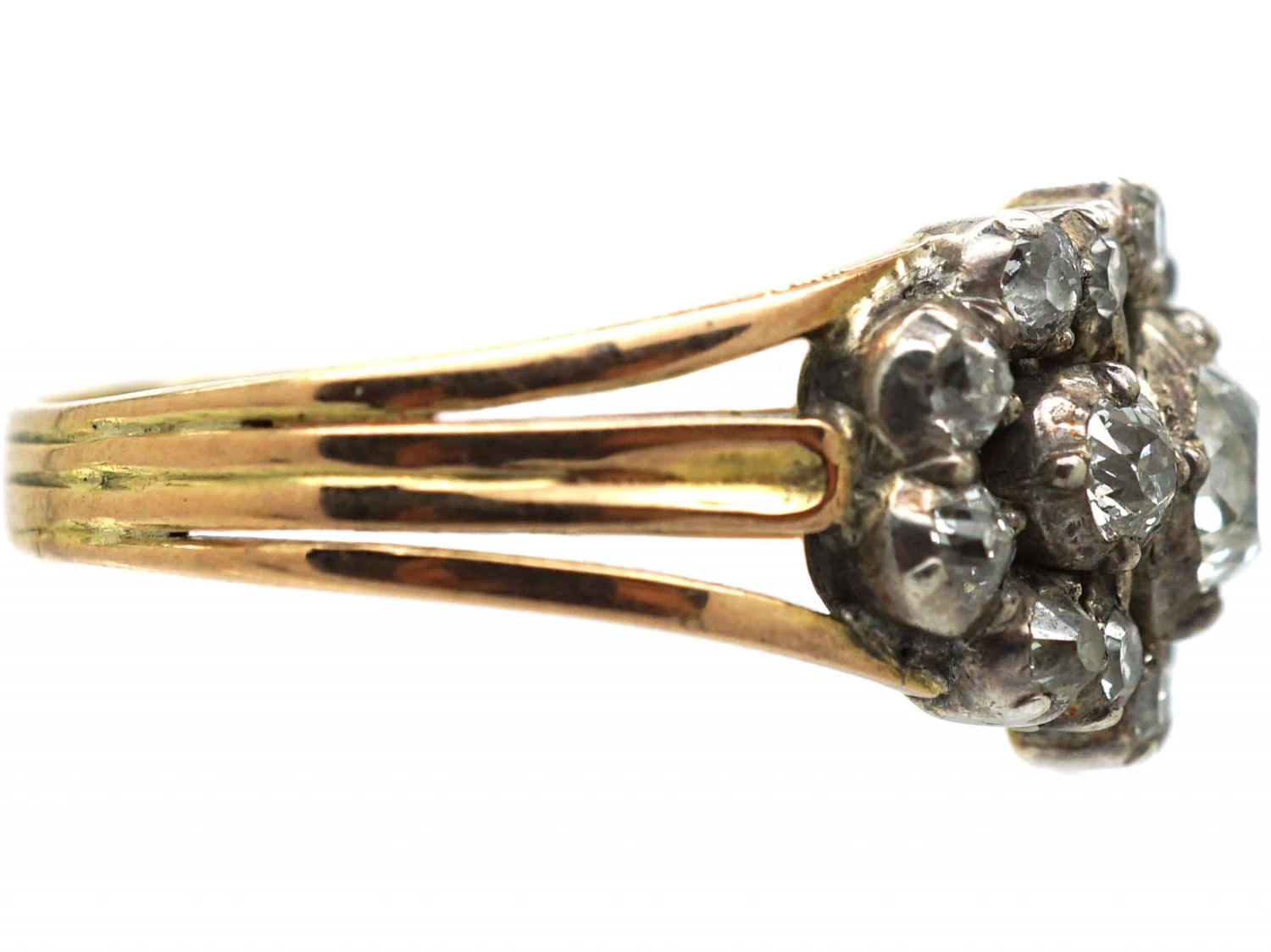 top set with three old mine cutAn 18th, 19th and early 20th century diamond shape, typically cushion or asymmetrical, marked by a small table, a high crown and a large culet. Culets are the small flat facets at the bottom of a stone which appear to the untrained eye as a hole in the middle of the stone. Before the advent of modern machinery which allows for the precise faceting we see tod… diamonds with the largest in the middle. Around the larger diamonds are sixteen small old mine cut diamonds. The shankThe circle of metal that attaches to the decorative part of a ring and encircles the finger. is 15ct62.5% pure gold (or 625 parts pure gold and 375 parts other metals). Popular during the Victorian, Edwardian and Art Deco eras but was discontinued in the mid-1930s. gold. It has a really good look about it with the slightly dull colour of the silver that sets off the stones very well especially when worn in candle lit settings which was the original intention.