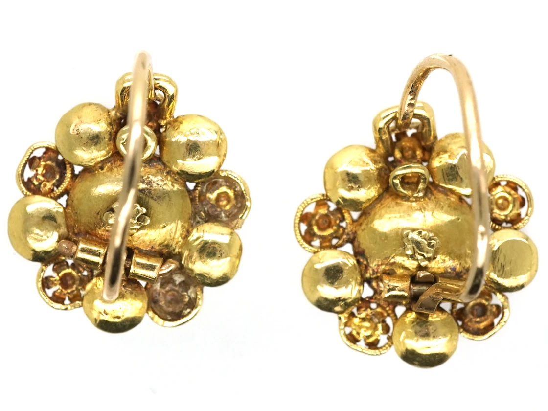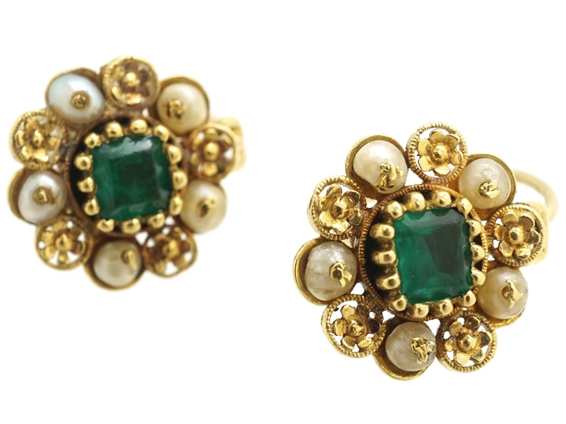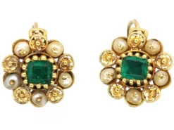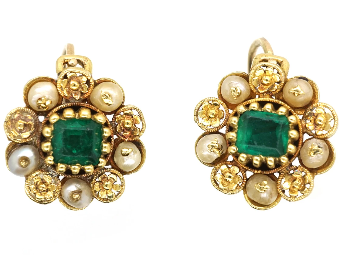 A pretty pair of 18ct75% pure gold (or 750 parts pure gold and 250 parts other metals) gold earrings. Each one is set with a rectangular emeraldOne of the four ‘precious’ stones. An intense, deep green is the most desirable colour for emeralds. Flaws and cloudiness (‘jardin’) are very common in emeralds, so stones are often oiled, irradiated, and dyed to improve their look. Synthetic emeralds have fewer imperfections and are hard to set apart from natural stones. Emeralds belong to the beryl… and five naturalA natural stone is called such because it has not been subjected to any treatments. pearls with small gold flowers in between. They were made circa 1780-1820 and are most likely of Spanish origin. The wires hinge back so they go in to the ear from behind.