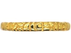A rare 18ct75% pure gold (or 750 parts pure gold and 250 parts other metals) gold ring that was made circa 1800-1820. It is a lovely narrow design with repousséThe raising of a pattern in relief on metal by beating from the under side. decoration featuring scrolls and roses that are typical of the GeorgianJewellery made in the Georgian era (1714-1830). period. A perfect ring that would match a Georgian ring or other styles too. This ring is size UK P and cannot be sized