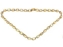 A gorgeous GeorgianJewellery made in the Georgian era (1714-1830). riviere necklace that was made circa 1820. It has been set in cut down rub over settings with a stunning row of thirty four precious topazIt comes in many colours, including brown, green. blue, yellow, red, pink and orange. Topaz is very hard, being 8 on the Mohs scale, with a high cleavage. gemstones. The warm, naturalA natural stone is called such because it has not been subjected to any treatments. colour of the topaz looks stunning when worn.