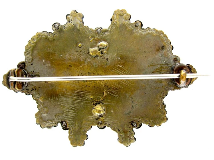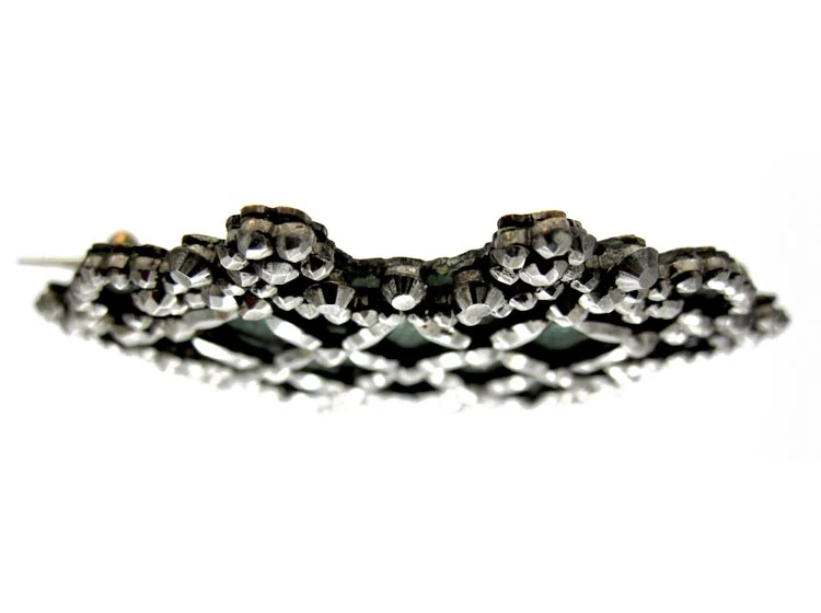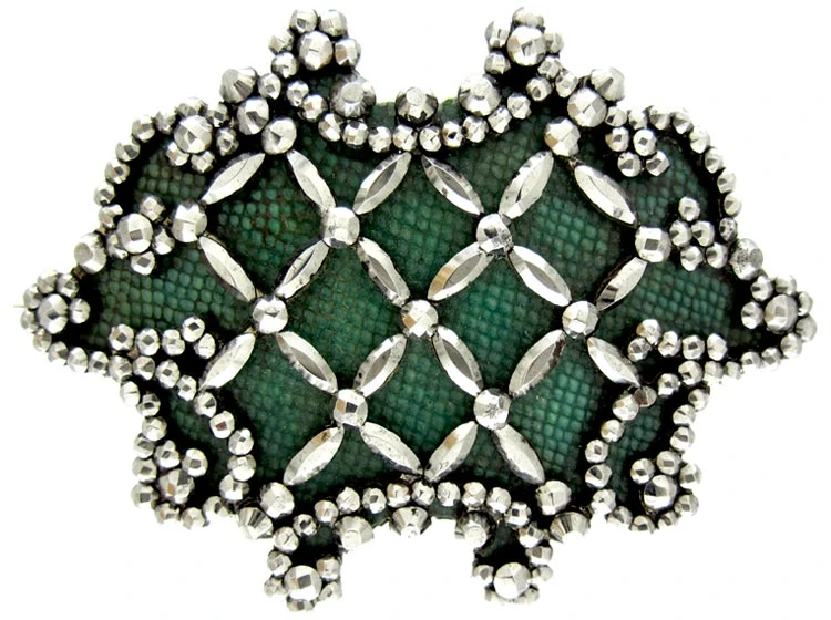 This an unusual piece of GeorgianJewellery made in the Georgian era (1714-1830). cut steel, because the background is green chagreen, which is snake’s skin. It was made circa 1800.