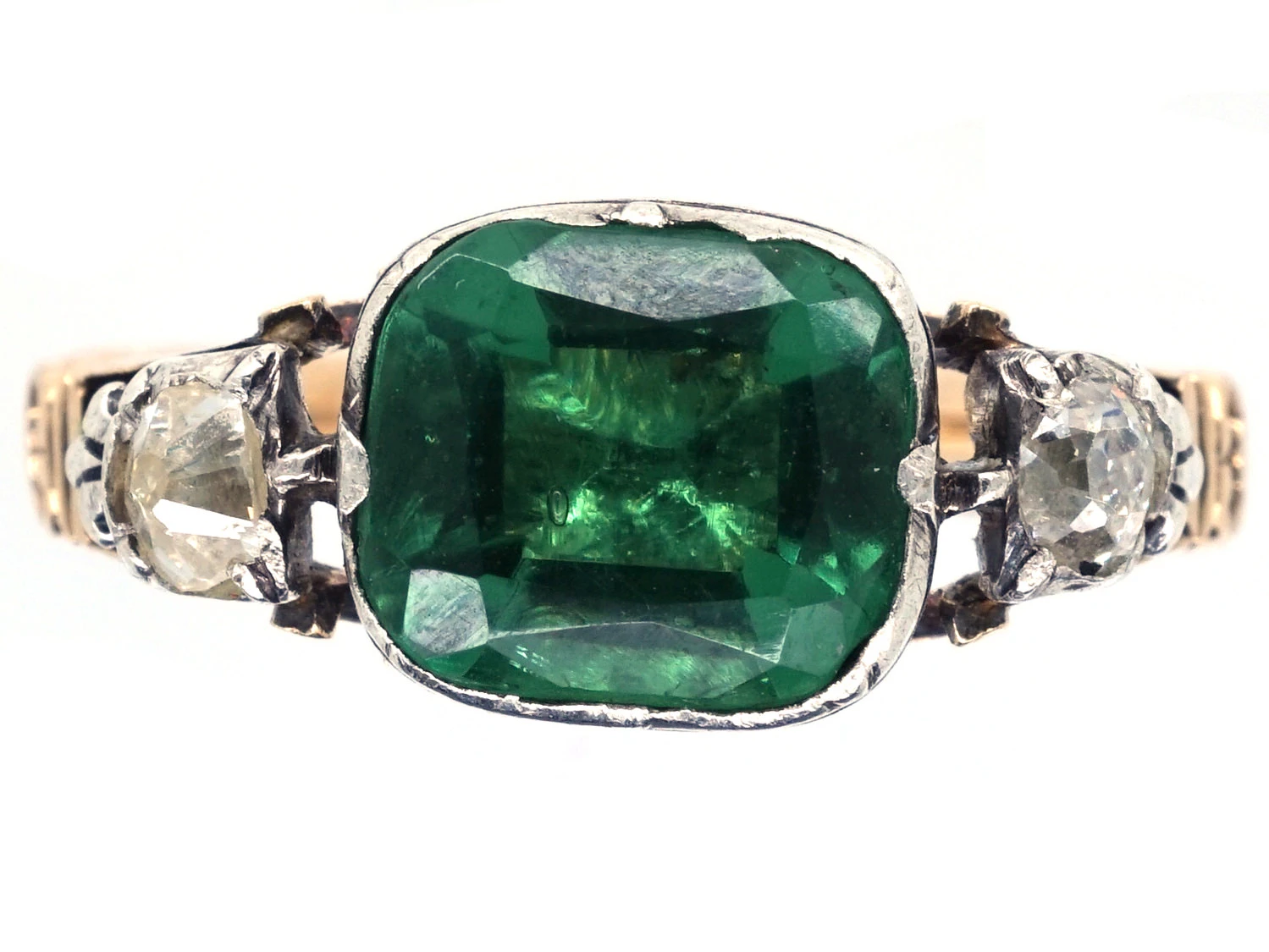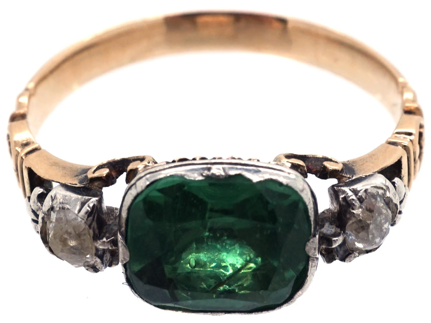 GeorgianJewellery made in the Georgian era (1714-1830). ring with a rectangular green pasteGlass made to resemble gem materials, which may be moulded, faceted, carved, etc. in the centre. Emeralds were scarce and very expensive in the early 1800s so paste was often used and this ring is a good example.