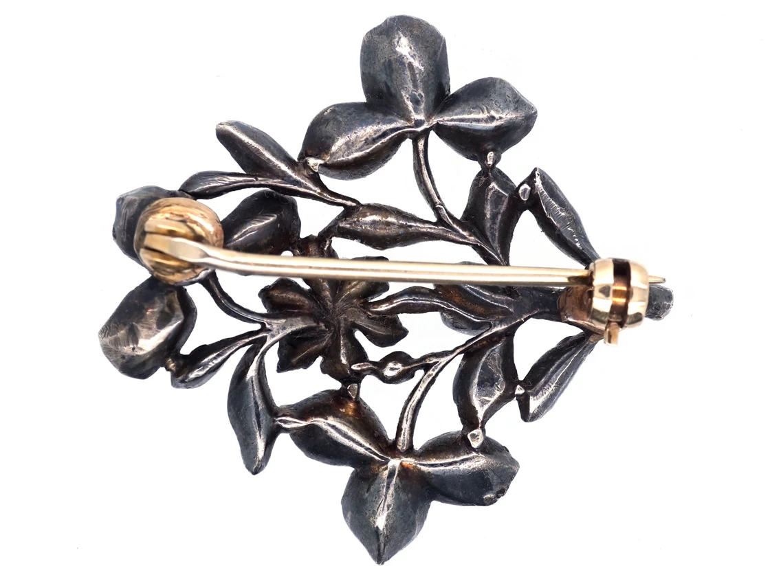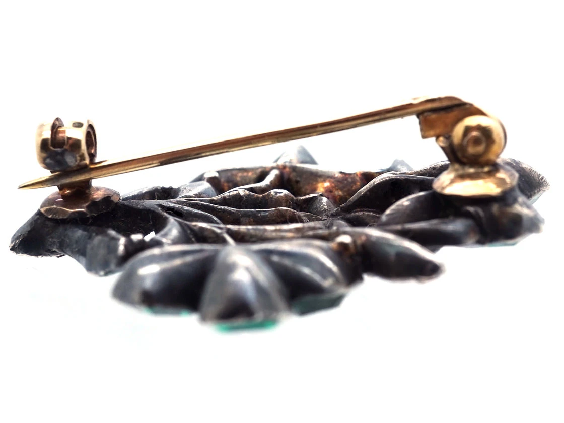 A beautiful and rare Giardinetti brooch (Italian for garden brooch) that was made circa 1750. This GeorgianJewellery made in the Georgian era (1714-1830). Giardinetti brooch is set with diamonds, rubies, topazIt comes in many colours, including brown, green. blue, yellow, red, pink and orange. Topaz is very hard, being 8 on the Mohs scale, with a high cleavage. and emeralds in silverA metallic element which is malleable and ductile, and white in colour, making it ideal for use in jewellery. It is usually mixed with copper to improve its hardness.