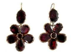 A good pair of GeorgianJewellery made in the Georgian era (1714-1830). gold and almandineA variety of red garnet that is transparent and commonly deep crimson with tinges of purple. Its colour can resemble that of ruby. It is cut in several forms; when cut en cabochon (usually as hollow cabochon to lighten the colour), it is called carbuncle. garnetDescribes a group of several closely related minerals. Garnets come in a variety of colours, however the most common colour is dark red. In descriptions, βgarnetβ tends to refer to dark red stones unless otherwise specified. earrings. The garnets are foil backedA thin metal foil placed behind a gemstone within a closed-back setting to improve its optical performance. Metallic foil improves the reflectivity of certain gemstones, whilst coloured foils act as colouring agents when placed behind colourless materials, such as paste and rock crystal. These stones were typically set in silver closed backs to shield the fo… to make them more luminous.