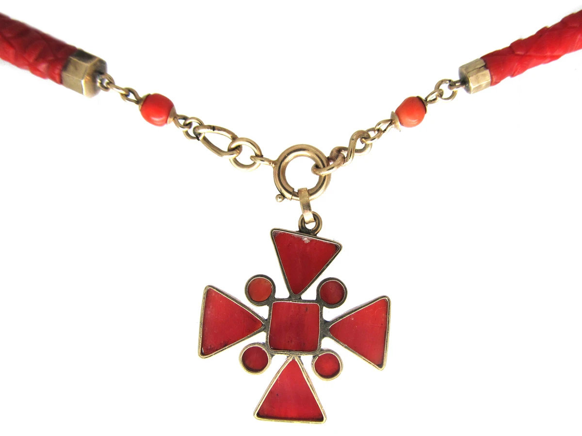 A late GeorgianJewellery made in the Georgian era (1714-1830). carved coralAn organic gem, calcium carbonate with a trace of carotene, deposited by tiny sea creatures living in the depths of warm seas in huge colonies. It grows in branches that look like underwater trees. Coral is believed to be one of the oldest forms of gemstone jewellery, with some pieces dating back as far as 23,000 BC. Maltese cross on a coral barrel linked chain, made circa 1820. The eight outer pointsA unit of weight for a diamond, being one-hundredth of a metric carat. It is used for weights that are decimal fractions of a carat, and all figures after the second decimal point are, in the diamond and jewellery trade, generally discarded. of this cross are symbolic of regeneration. They are sometimes said to represent the eight beatitudes. The cross was the emblem of the Knights of St. John, who were driven from Rhodes to the island of Malta by the Turks. Malta is the island where St. Paul was shipwrecked. It is universally agreed that the four arms of the Cross stand for the four Cardinal Virtues – prudence, temperance, justice and fortitude.