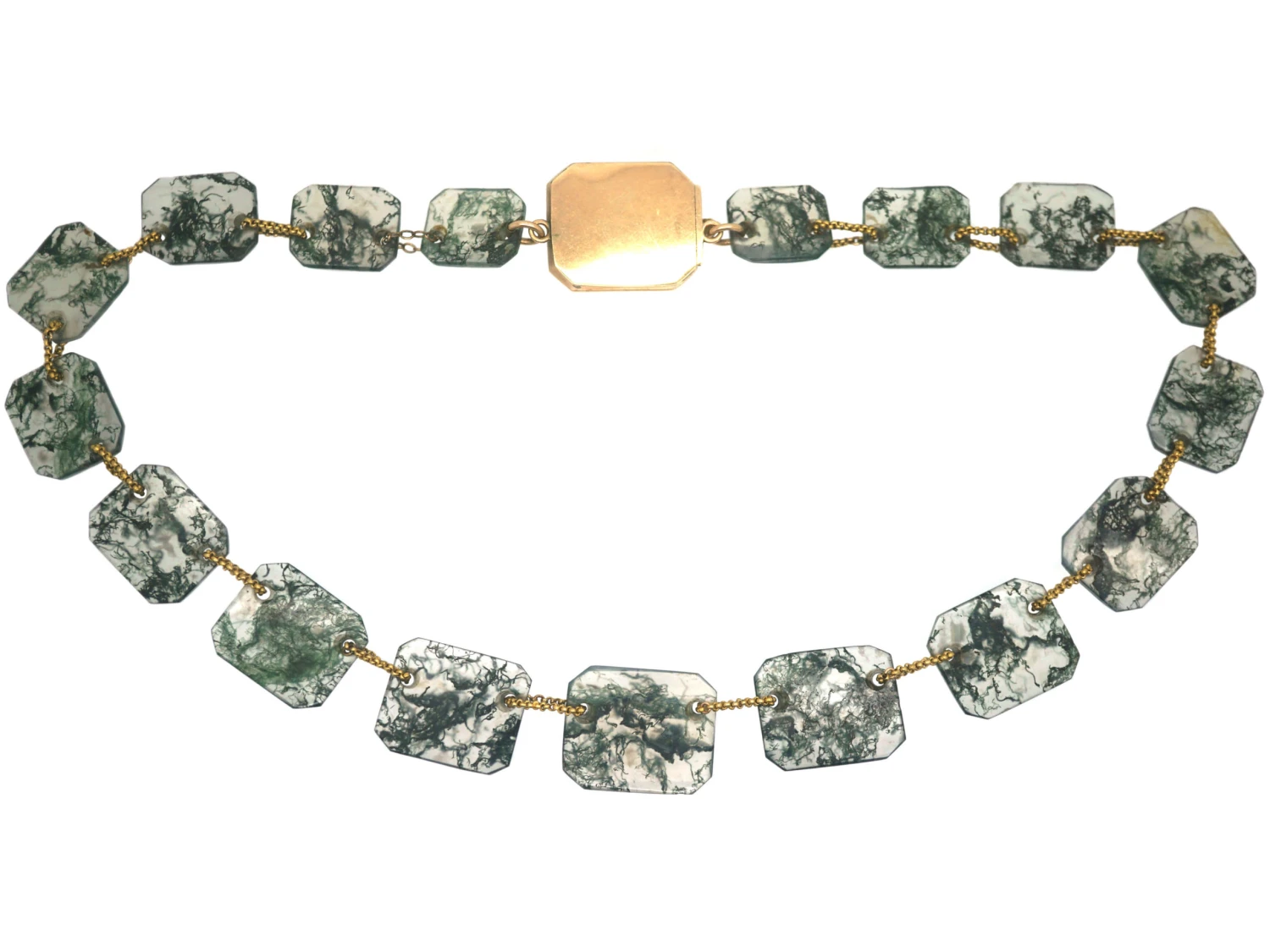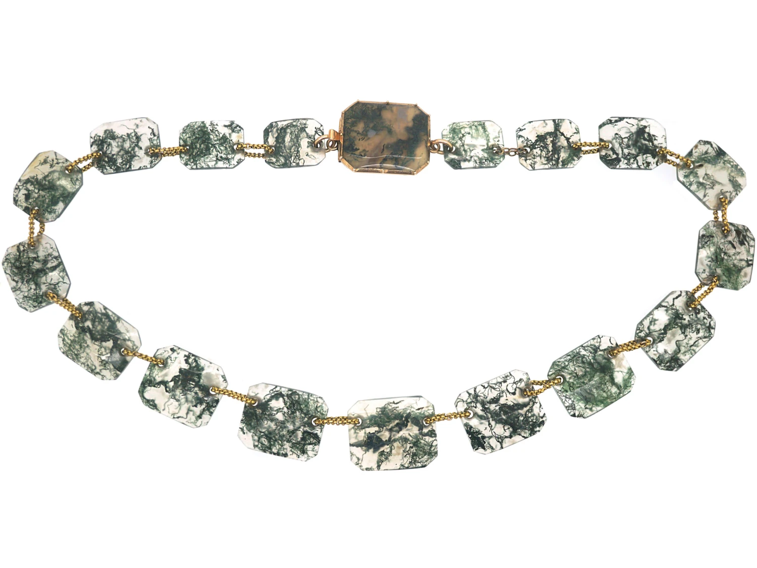 A beautiful 18ct75% pure gold (or 750 parts pure gold and 250 parts other metals) gold and moss agateA type of chalcedony. Varying amounts of iron oxide inclusions produce moss like effects. necklace that was made circa 1820. it is composed of seventeen specially chosen graded moss agates with a further larger moss agateA variety of cryptocrystalline quartz (chalcedony), typically banded in appearance. The use of agate in jewellery dates back to the Stone Age. that forms the hidden clasp. The facetedA faceted stone has small, flat-cut surfaces that make a sparkling effect on transparent stones. Facets act as both mirrors and windows. Reflecting light and channelling light into a stone where it refracts and re-emerges. agates have drilled holes and are linked by fine 18ct gold chains. In the GeorgianJewellery made in the Georgian era (1714-1830). period there was a fascination for naturalA natural stone is called such because it has not been subjected to any treatments. agates that were sourced in England then polished and faceted and set in to brooches, necklaces and earrings. This necklace is a superb surviving example of the craft.