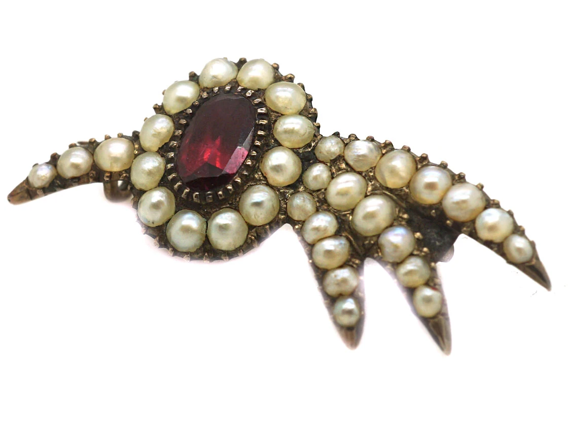 An unusual 9ct37.5% pure gold (or 375 parts pure gold and 625 parts other metals) gold brooch set with a foil backedA thin metal foil placed behind a gemstone within a closed-back setting to improve its optical performance. Metallic foil improves the reflectivity of certain gemstones, whilst coloured foils act as colouring agents when placed behind colourless materials, such as paste and rock crystal. These stones were typically set in silver closed backs to shield the fo… flat cut almandineA variety of red garnet that is transparent and commonly deep crimson with tinges of purple. Its colour can resemble that of ruby. It is cut in several forms; when cut en cabochon (usually as hollow cabochon to lighten the colour), it is called carbuncle. garnetDescribes a group of several closely related minerals. Garnets come in a variety of colours, however the most common colour is dark red. In descriptions, ‘garnet’ tends to refer to dark red stones unless otherwise specified. and naturalA natural stone is called such because it has not been subjected to any treatments. split pearls. It was most likely originally made to celebrate the sighting of Halley’s comet. Halley’s Comet was named after Sir Edmund Halley, the royal astronomer. He formed a view that all of the sightings between 1531 and 1682 were actually one single comet, which circled the sun every 75-76 years. Halley predicted that it would return again in 1759 and, when it did, it received its name. The next sighting was in 1835 and, soon after, jewellers began creating Halley’s Comet pins, which were influenced by the shape of the comet as it approached the sun, it heated up and produced a tail that streaks away from the comet’s head. These intricate small pins are rare and significant historical pieces. Both the Georgians and Victorians had an affinity for symbolism and meaning, and created jewellery to represent birth, love, betrothal, and mourningRings made especially to mark the death of a loved one. Often called ‘memento mori’ rings. Rare examples survive intact and are highly collectable. or death.