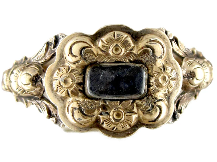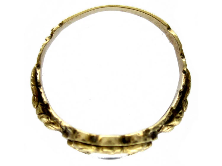 A delicate GeorgianJewellery made in the Georgian era (1714-1830). MemorialTypically featuring skulls, urns and other symbols of death, these 16th-18th century jewels were inscribed with the names and dates of the deceased. ring with typical repoussee work around the locket compartment and on the and sides of the shankThe circle of metal that attaches to the decorative part of a ring and encircles the finger..