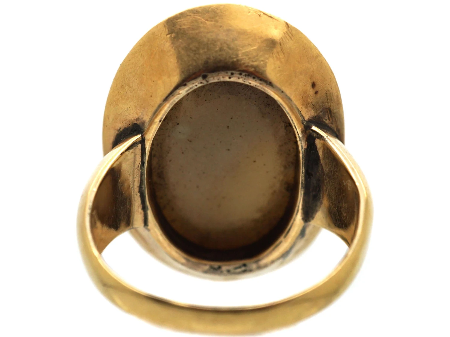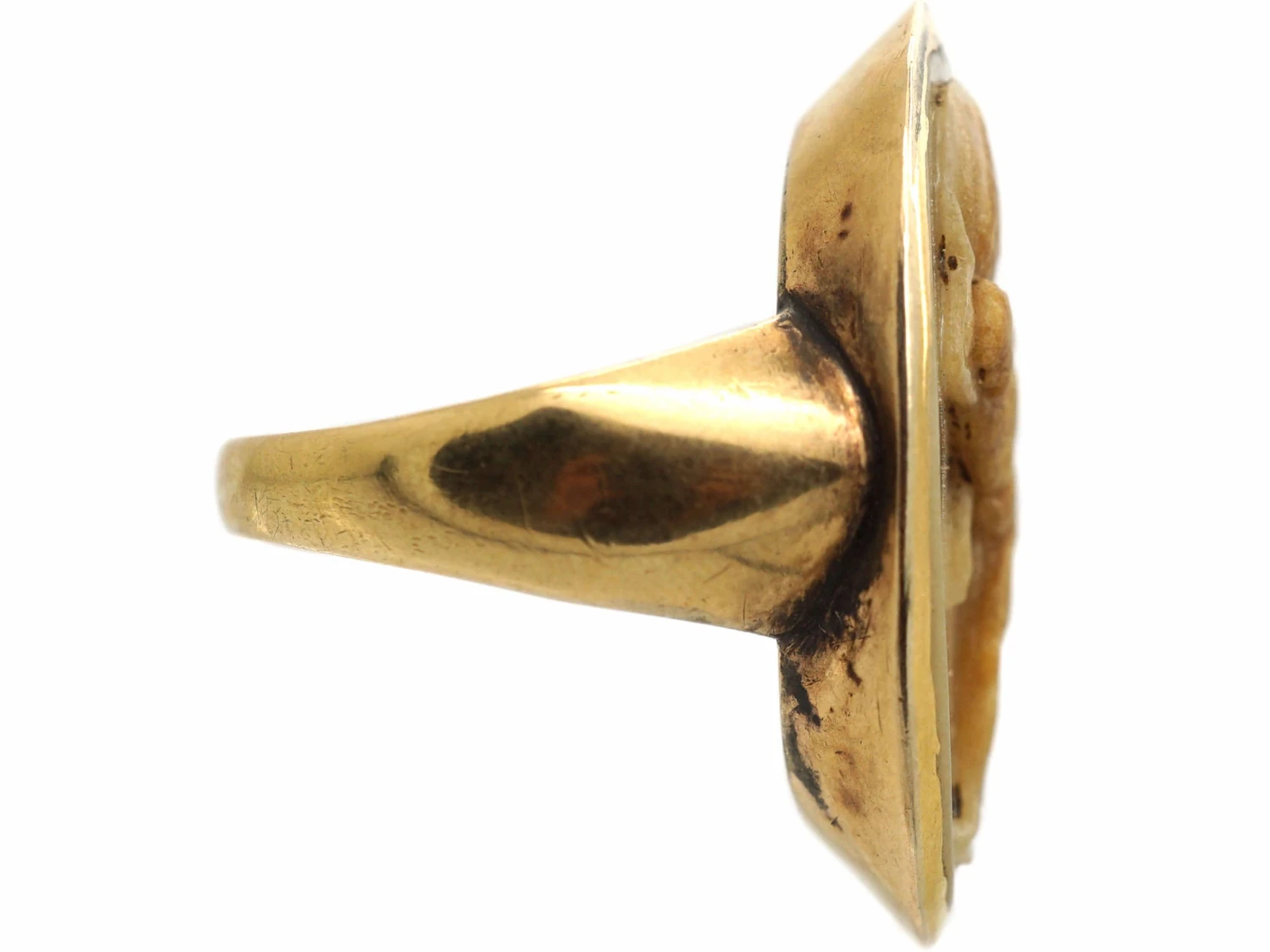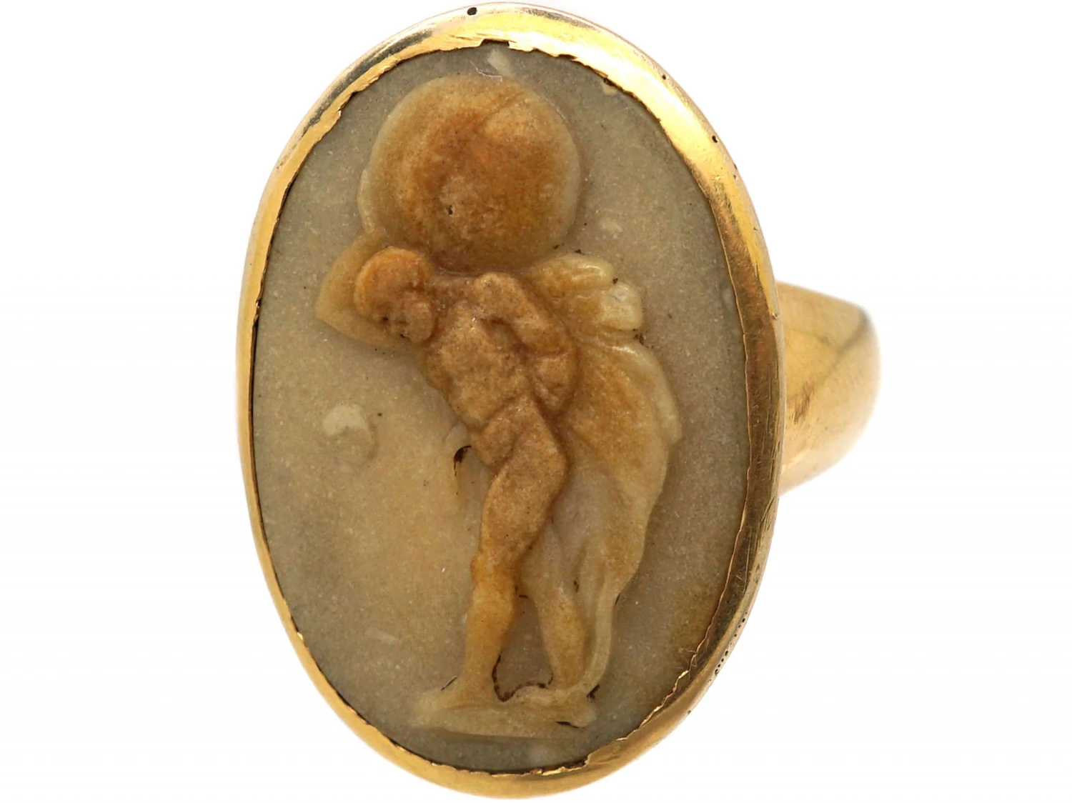 This style of ring became popular in the late 18th century, following the discovery of the ruins of the Roman town of Pompeii in 1748, inspiring a trend for the classical. Our example centres on a large, oval hardstone cameoA layered stone or shell in which the design is cut in relief where the main design is carved onto the top layer and the remainder is carved away to reveal the next layer using the natural colours of the stone or shell to produce the different shadings of the carving. This is done in shell, coral, lava and various stones. depicting Atlas, the Titan god who bore the world on his shouldersThe point on a ring where the central section meets the shank or band, often carved, decorated or inlaid with small diamond accent stones.. Regardless of the feats of Atlas, this 18ct75% pure gold (or 750 parts pure gold and 250 parts other metals) gold ring, with its broad shoulders and wide bandA type of ring which is an equal width all the way round. They are traditionally used for wedding rings.