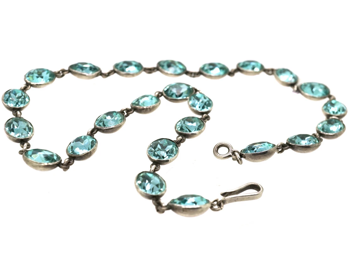 and pasteGlass made to resemble gem materials, which may be moulded, faceted, carved, etc. necklace. The paste is a lovely subtle blue colour almost “eau de nil” and would have imitated aquamarines. It has rub over settings over the foiled paste which gives it translucency. It was made in the early 19th century. The hook clasp is a later addition.