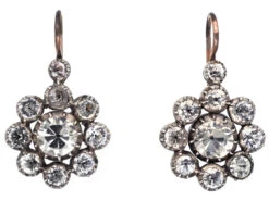 A lovely pair of GeorgianJewellery made in the Georgian era (1714-1830). pasteGlass made to resemble gem materials, which may be moulded, faceted, carved, etc. earrings. These earrings were the Georgianâs answer to costume jewelleryJewellery designed for wear with current fashions and usually made of inexpensive materials. Usually applied to two classes of jewellery: gem-set imitations, which resemble precious jewellery but are made of silver (sometimes rhodium-coated) or pinchbeck and set with substitutes for gemstones, e.g. marcasite, paste or synthetic gemstones; although usually th…. The paste was set with foilA thin metal foil placed behind a gemstone within a closed-back setting to improve its appearance. Metallic foil improves the reflectivity of certain gemstones, whilst coloured foils act as colouring agents when placed behind colourless materials, such as paste and rock crystal. The practice of foil-backing gemstones can be traced back to Minoan times (circa… behind it which had been pierced at the back with what is known as a black spot. This was to give the impression of a âculetâ which is when an old mine cutAn 18th, 19th and early 20th century diamond shape, typically cushion or asymmetrical, marked by a small table, a high crown and a large culet. Culets are the small flat facets at the bottom of a stone which appear to the untrained eye as a hole in the middle of the stone. Before the advent of modern machinery which allows for the precise faceting we see tod… diamondA precious, lustrous gemstone made of highly compressed carbon. Diamonds are one of the hardest materials known to mankind. Colours of diamonds range from colourless, yellow, orange and brown to almost black. Natural coloured (or âfancyâ) diamonds can be extremely rare. The cut, colour, clarity and carat weight of a diamond are the criteria jewellers use… was cut off at the back so as to refract more light through the stone. The effect was vey successful and Georgian paste jewellery can often be mistaken for the real thing when worn.