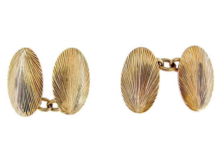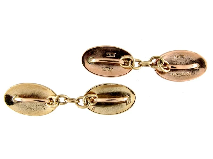 A well made pair of 9ct37.5% pure gold (or 375 parts pure gold and 625 parts other metals) cufflinks by Barnet Henry Joseph, an Art NouveauA movement within the arts, particularly jewellery, evolving out of a response to mass production and the industrial revolution (1890-1915). Jewellery of this period was heavily influenced by nature and femininity, with its sweeping lines and organic motifs. designer, working in Birmingham, circa 1920.