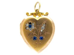A pretty 9ct37.5% pure gold (or 375 parts pure gold and 625 parts other metals) gold back and front heart shape locket which was made circa 1910. It has a flower motif which is set with different colour pasteGlass made to resemble gem materials, which may be moulded, faceted, carved, etc. . There is one paste missing which will be replaced soon!