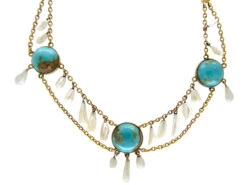 A really impressive necklace which was retailed by the firm of Murrle Bennett, based in Regent Street, London. They used various designers often collaborating with Theodor Fahrner. Sometimes you find both monograms of the two firms on a piece of jewellery. This necklace carries the Murrle Bennettt mark and is 9ct37.5% pure gold (or 375 parts pure gold and 625 parts other metals) gold, and set with three turquoiseTurquoise is an opaque gem and is often formed in what is called matrix, a black or brown veining derived from the host rock in which the gem forms. In fine jewellery, unblemished sky blue turquoise is the ideal, although regularly patterned matrix turquoise is also sought-after. matrixThe parent or host rock in which a mineral is contained. Most often associated with turquoise or opal. and Mississippi pearls, which was a fashionable combination in the Art nouveauA movement within the arts, particularly jewellery, evolving out of a response to mass production and the industrial revolution (1890-1915). Jewellery of this period was heavily influenced by nature and femininity, with its sweeping lines and organic motifs. era. It was made circa 1910.