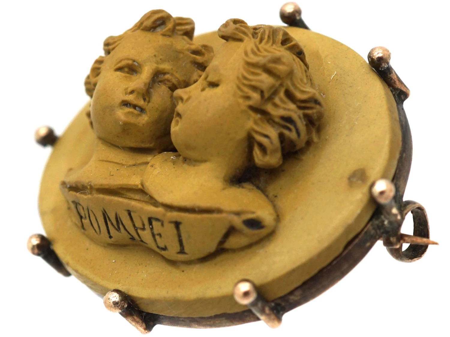 This brooch would have been sold in Pompei circa 1820 to European tourists who were doing “The Grand Tour” as it was known. This was the 18th and 19th century custom of a traditional trip through Europe undertaken by upper class young European men of sufficient means and rank (typically accompanied by a chaperone, such as a family member) when they had come of age. Inevitably Pompei was on the list as it personified everything from Roman classical antiquity which was a highly fashionable subject to study. Shops traded in artefacts and trinkets. This brooch is a good example of how the lava from Mount Vesuvius was carved to portray two young children. It is mounted in 9ct37.5% pure gold (or 375 parts pure gold and 625 parts other metals) gold.