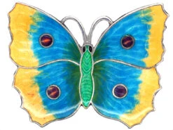 butterfly brooch. The wings are well enamelled with yellow edges and turquoiseTurquoise is an opaque gem and is often formed in what is called matrix, a black or brown veining derived from the host rock in which the gem forms. In fine jewellery, unblemished sky blue turquoise is the ideal, although regularly patterned matrix turquoise is also sought-after. blue with pale purple spots over an engraved silver base. The main body is green enamelA pigmented glass-like material used in powdered form and fused onto the metal surface of a piece of jewellery. with black eyes. It was made circa 1920-1930.