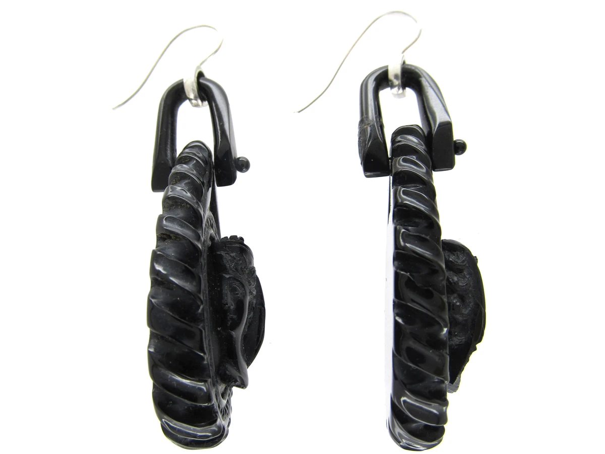 A great pair of jet earrings which have been carved with classical ladies heads on them. They are large and impressive and were made circa 1880 in Whitby near where jet, which is fossilised wood, was sourced. The black mineraloid jet, the compressed remains of ancestors of the monkey-puzzle tree, is found in the cliffs and on the moors and has been used since the Bronze Age to make beads. The Romans are known to have mined it in the area. In VictorianJewellery made in the the Victorian era (1839-1901). times jet was brought to Whitby by pack pony to be made into decorative items. It was at the peak of its popularity in the mid-19th century when it was favoured for mourningRings made especially to mark the death of a loved one. Often called ‘memento mori’ rings. Rare examples survive intact and are highly collectable. jewellery by Queen Victoria after the death of Prince Albert.