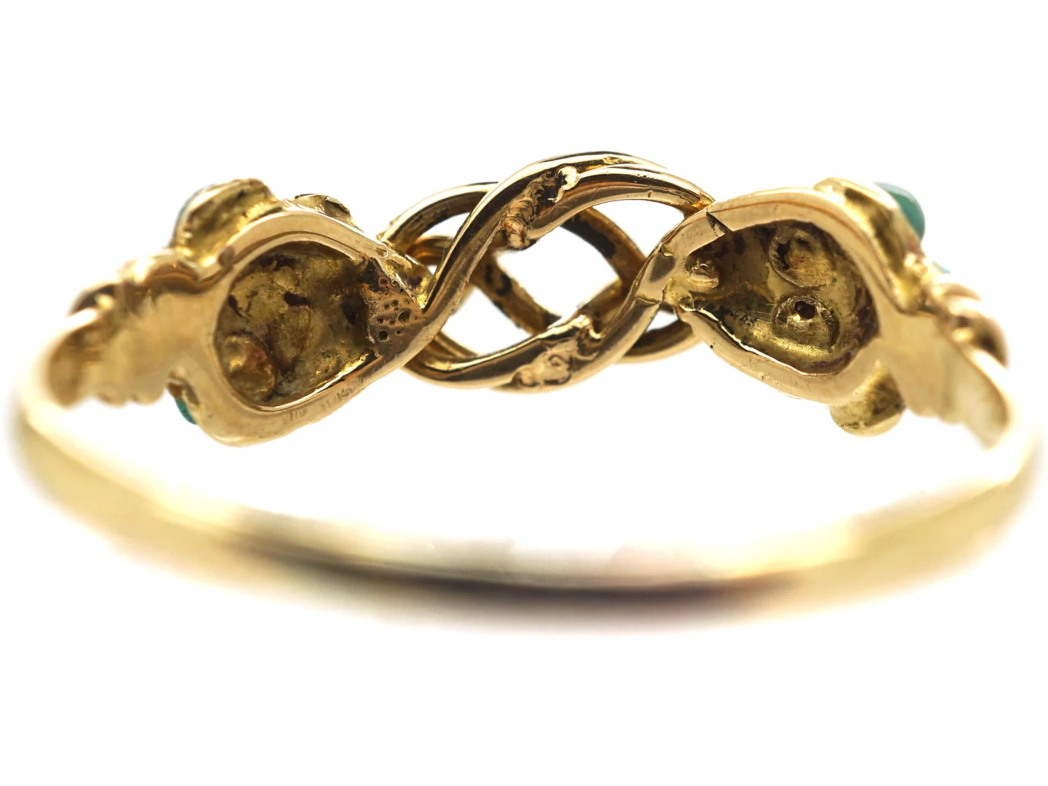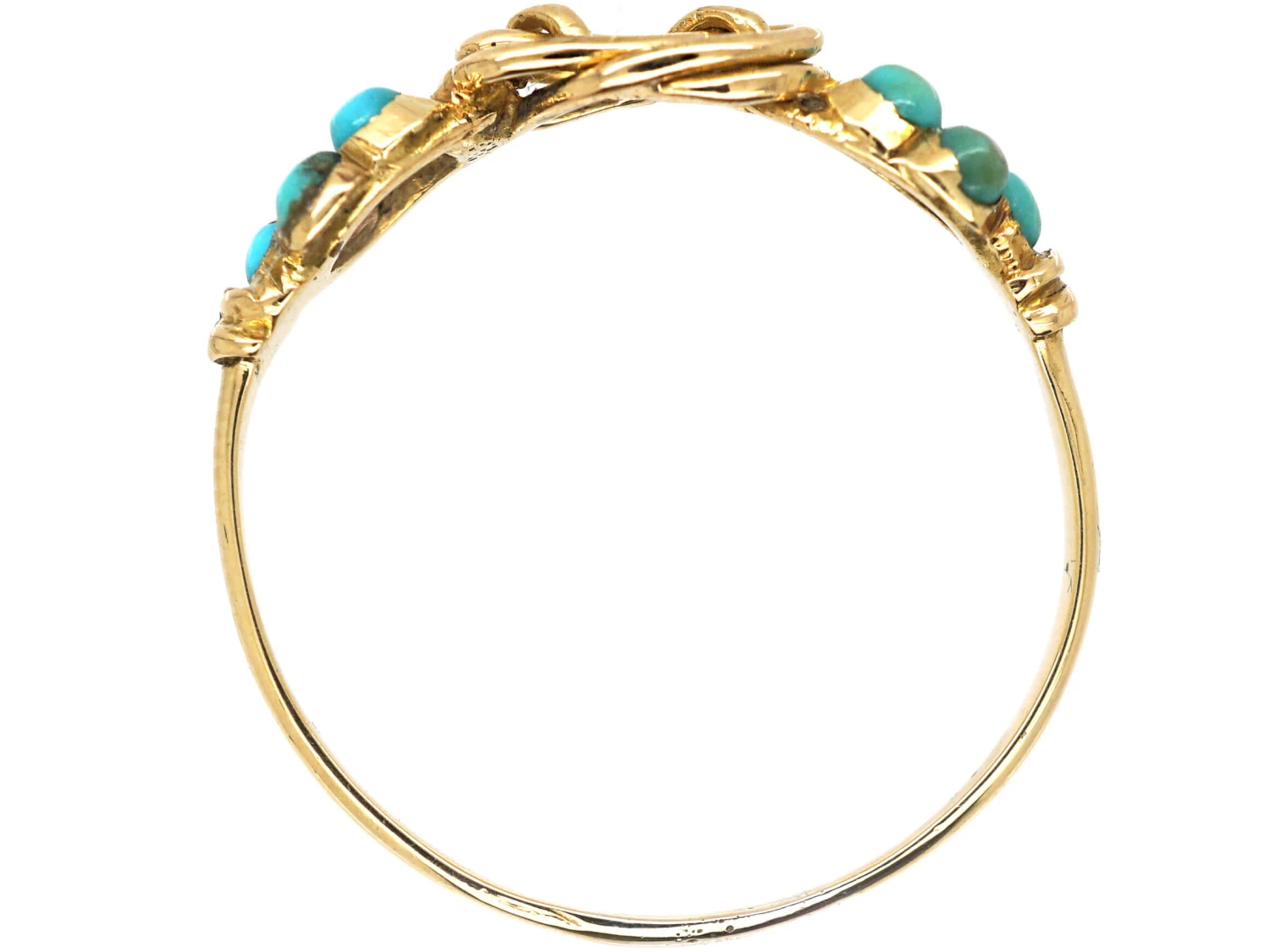 An unusual 15ct62.5% pure gold (or 625 parts pure gold and 375 parts other metals). Popular during the Victorian, Edwardian and Art Deco eras but was discontinued in the mid-1930s. gold ring that was made circa 1830. It has a sweet meaning with two turquoiseTurquoise is an opaque gem and is often formed in what is called matrix, a black or brown veining derived from the host rock in which the gem forms. In fine jewellery, unblemished sky blue turquoise is the ideal, although regularly patterned matrix turquoise is also sought-after. set “forget me not” flowers and a further gold double lover’s knotA type of finger ring, often worn as a betrothal ring or an engagement ring, but sometimes merely as a token of affection, having the bezel made from twisted wire so as to form a complicated four-loop knot. Such rings were so worn engraved with a simple inscription or merely an appropriate symbol. joining the two flowers. So it would have been a gift of love and is as wearable today as it was in the 1830s.