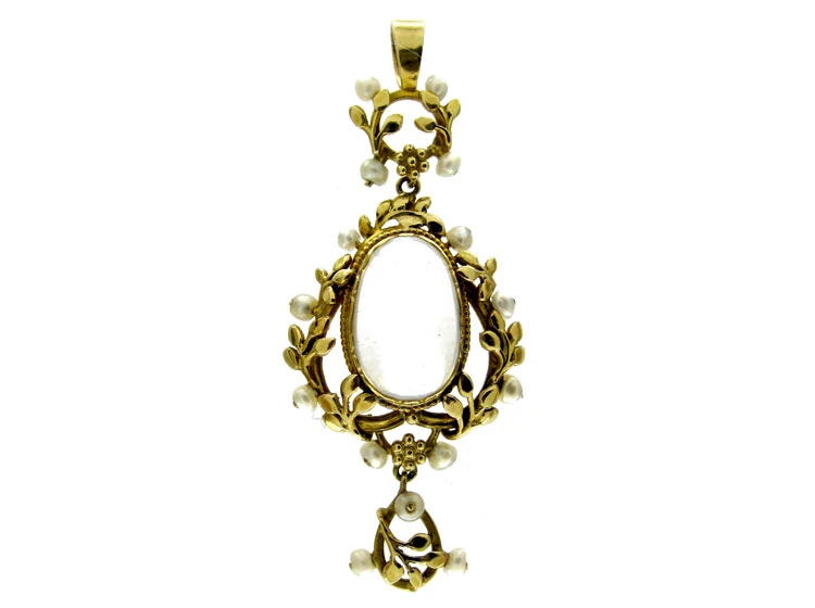 A pretty pendant retailed by Liberty, circa 1910. It is 15ct62.5% pure gold (or 625 parts pure gold and 375 parts other metals). Popular during the Victorian, Edwardian and Art Deco eras but was discontinued in the mid-1930s. gold set with naturalA natural stone is called such because it has not been subjected to any treatments. pearls, and a central moonstoneMoonstone, the alluring pale gemstone, is known for its attractive pearly sheen and is so named for its resemblance to the moon. , much favoured in that period. It was probably designed by Jessie M King.