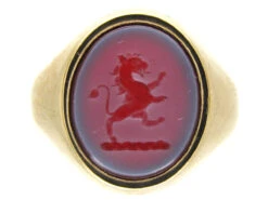 A very smart 9ct37.5% pure gold (or 375 parts pure gold and 625 parts other metals) gold signet ringA ring with a central plaque on which one’s initials, a seal, or a crest is engraved. with a rampant lion carved into the banded carnelian​A translucent red variety of chalcedony which in its turn is a form of cryptocrystalline quartz. ​Carnelian has​ been known and used since antiquity when it was sourced from the surfaces of the Egyptian and Arabian deserts. The ​most prized carnelian has a true blood-red color. (agateA variety of cryptocrystalline quartz (chalcedony), typically banded in appearance. The use of agate in jewellery dates back to the Stone Age.). Assayed When the property or concentration of a precious metal is measured. in London in 1966.