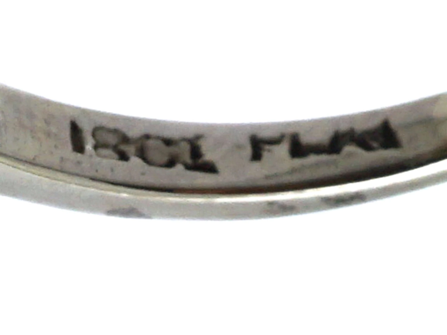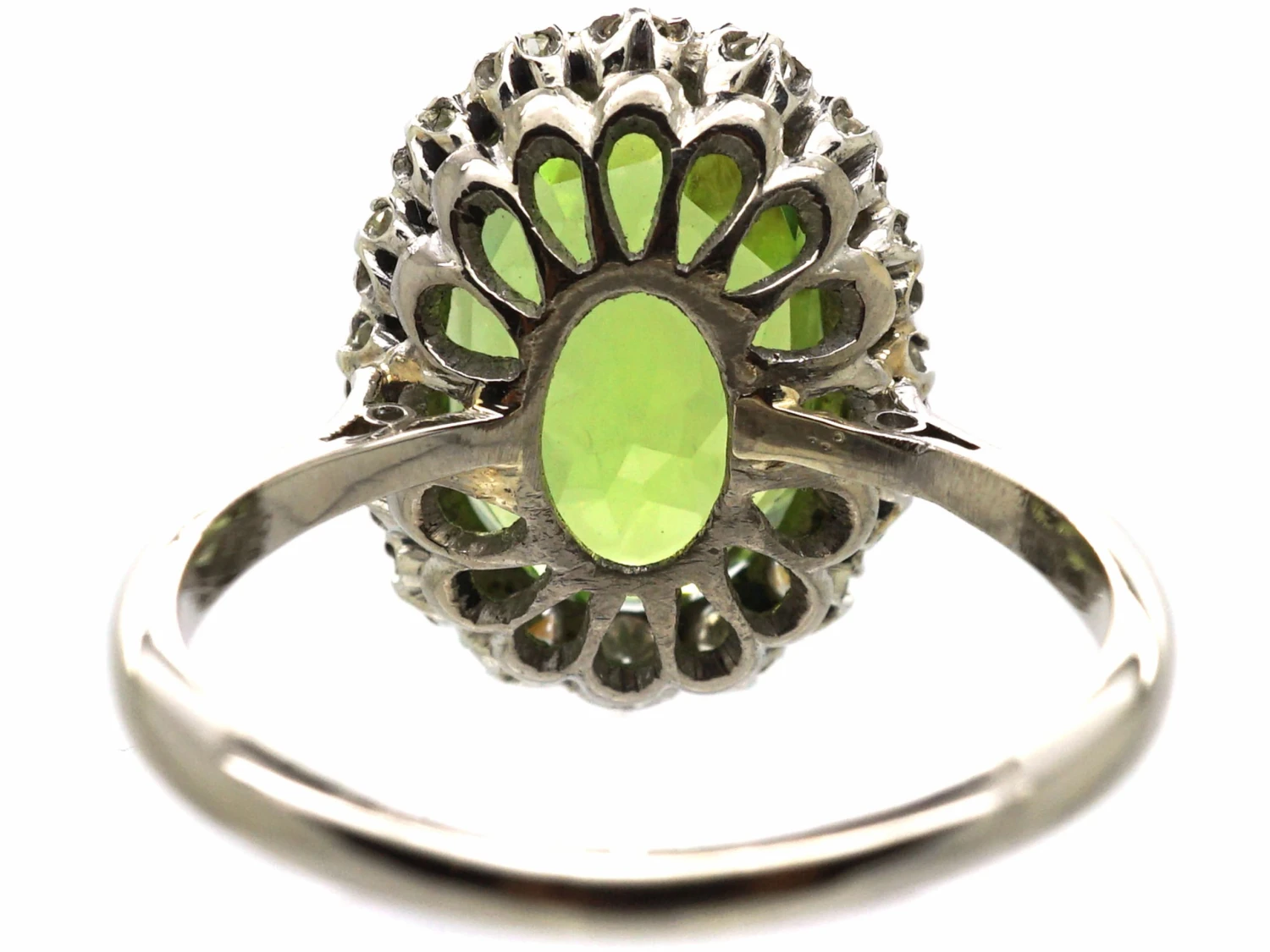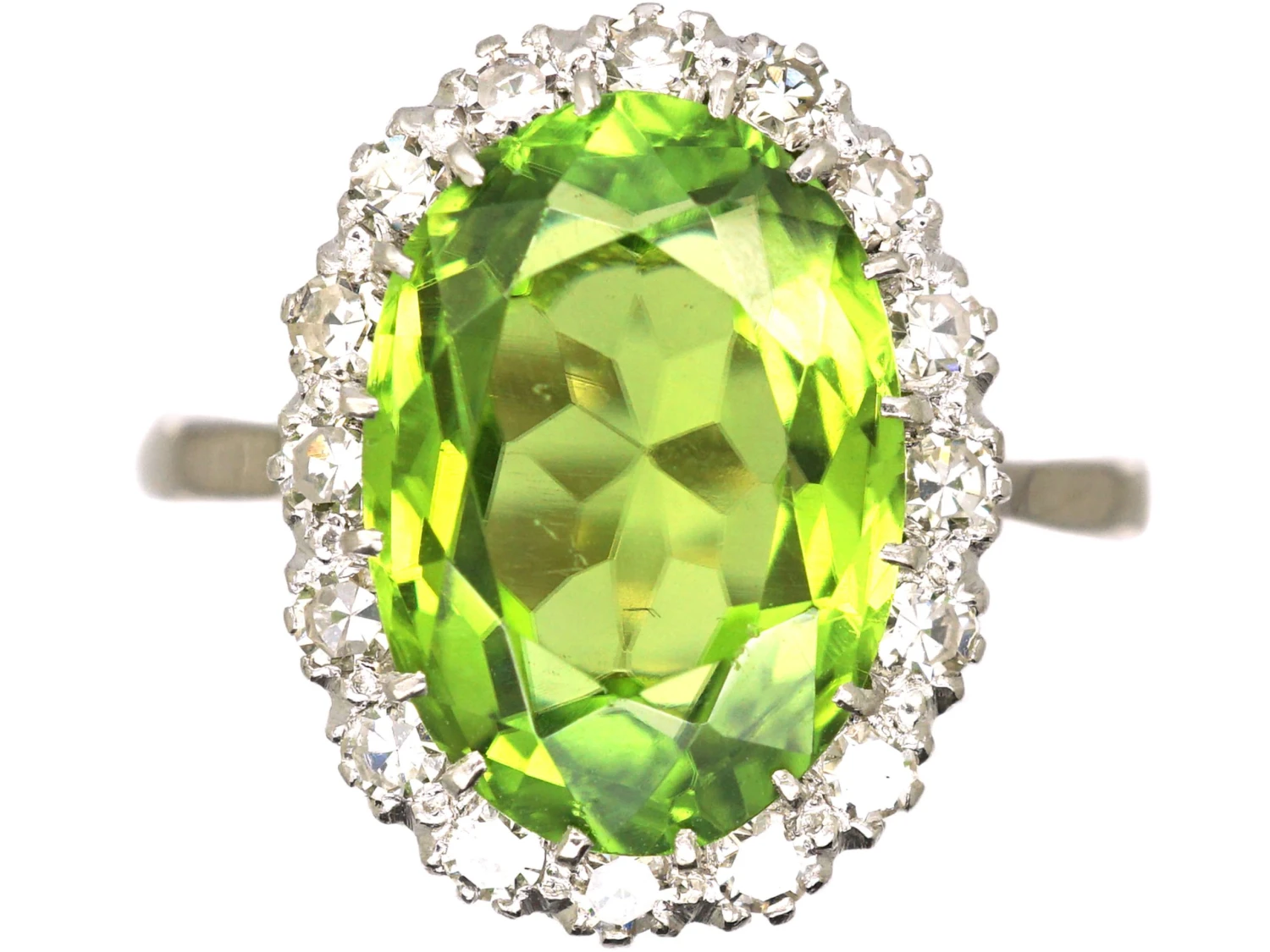 Peridot is a beautiful stone and is associated with happiness, abundance and light. It is also the birthstone for the month of August. The large claw set peridot in this ring is a lovely intense apple green colour and has an approximate weight of 4.25 carats. . It is surrounded by claw set good white diamonds that add sparkle to this pretty ring. It was made circa 1950 and is 18ct white gold with a platinum top.