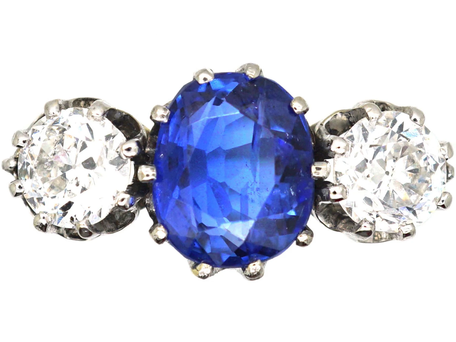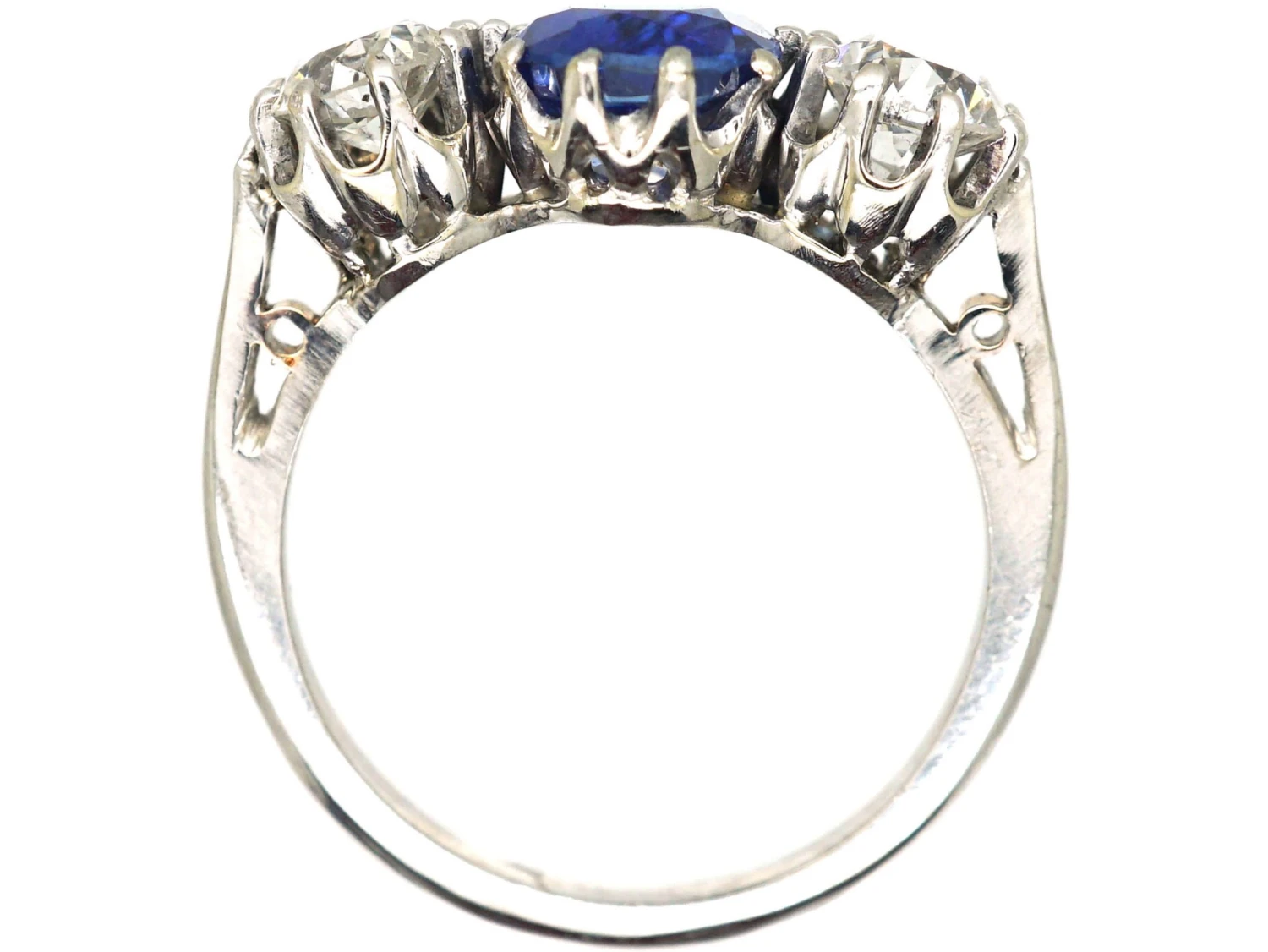 . It is a naturalA natural stone is called such because it has not been subjected to any treatments. unheated stone from BurmaBurma (modern day Myanmar) is one of most celebrated sources of the gemstone, ruby. Coming out of Mogok, known as the ‘Valley of Rubies’, the gemstones, along with sapphires and spinels, have been sourced there for at least 1,500 years, and are prized for their luminosity. (Myanmar). It has a known weight of 2.03 caratsThe unit of weight for a diamond or other gemstone and also for a pearl. Abbreviated ‘ct’, 1 carat is equal to 0.2 grams. In reference to gold, a unit of purity or fineness of gold and gold alloy, expressed as a number out of 24 parts by weight, e.g. ’24 carat’ signifies pure gold, ’18 carat’ 18/24th gold in the alloy, et cetera. Also abbreviated as ‘c… so it is an impressive size and has claw set bright white diamonds on either side. The two diamonds weigh approximately 1.00 caratThe unit of weight for a diamond or other gemstone and also for a pearl. Abbreviated ‘ct’, 1 carat is equal to 0.2 grams. In reference to gold, a unit of purity or fineness of gold and gold alloy, expressed as a number out of 24 parts by weight, e.g. ’24 carat’ signifies pure gold, ’18 carat’ 18/24th gold in the alloy, et cetera. Also abbreviated as ‘c… in total. The ring is accompanied by a gemmological report stating that the sapphire is a natural stone with no indications of heating, originating from Myanmar (Burma). An absolutely stunning 1950s ring that would make a really perfect engagement ring.