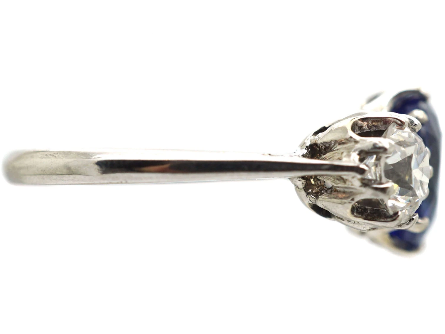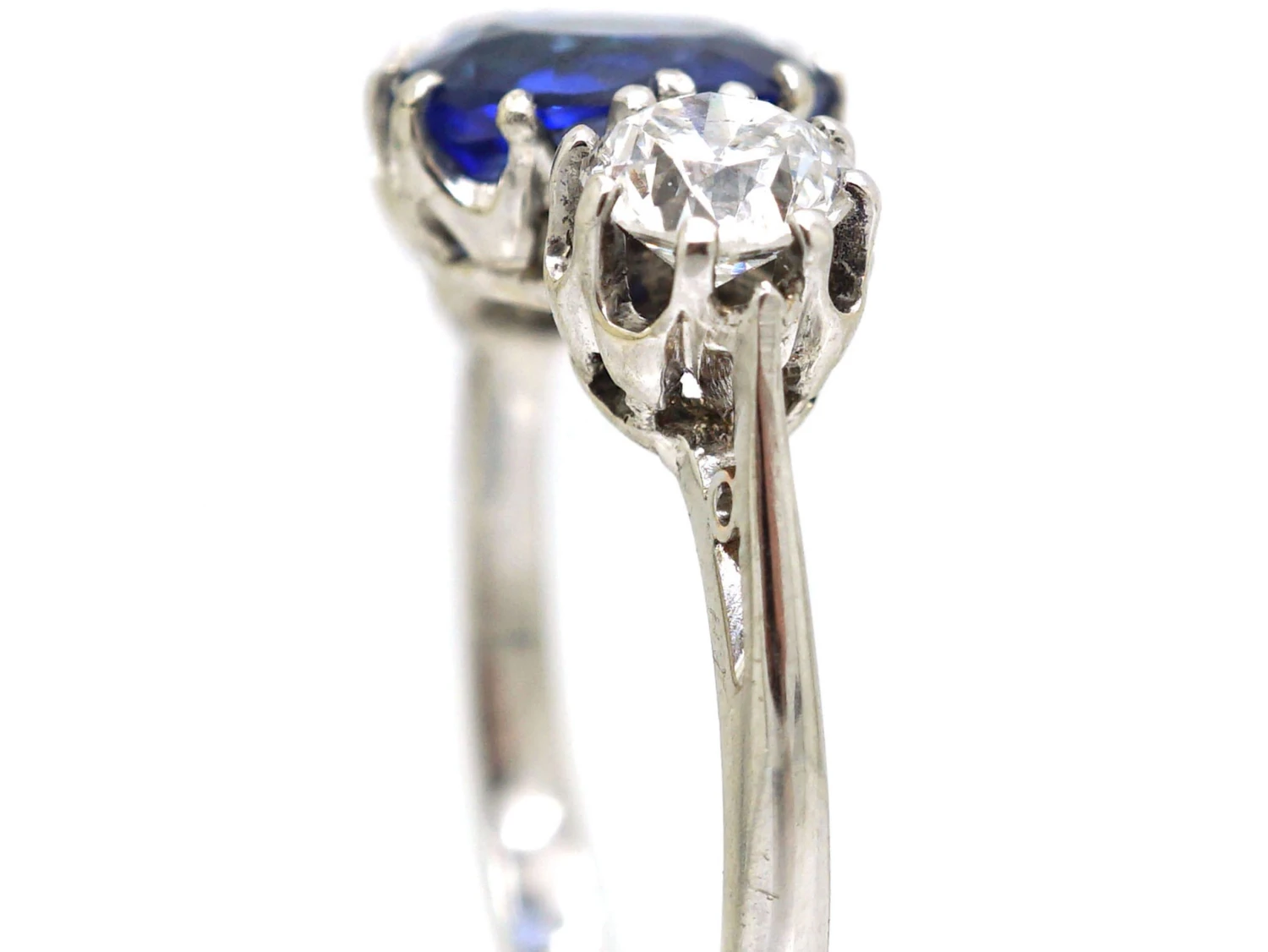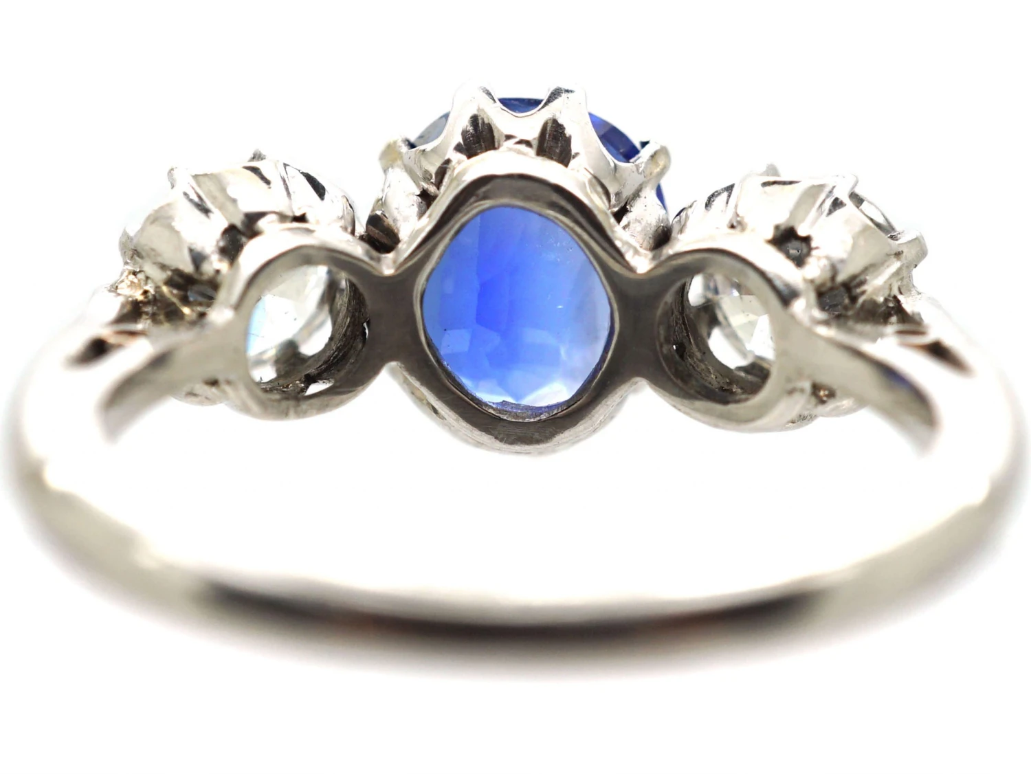 This is a pretty 18ct75% pure gold (or 750 parts pure gold and 250 parts other metals) white goldWhite gold is an alloy of gold and at least one other white metal – most often nickel or palladium (both of which act as a bleaching agent to reduce the natural yellow colour of the gold). ring clawA precious metal prong used to hold a gemstone in place. set with a beautiful oval shaped cornflower blue sapphireBlue is the best-known colour for this gemstone but it can be found in all colours of the spectrum. After diamond, sapphire is the hardest gemstone.