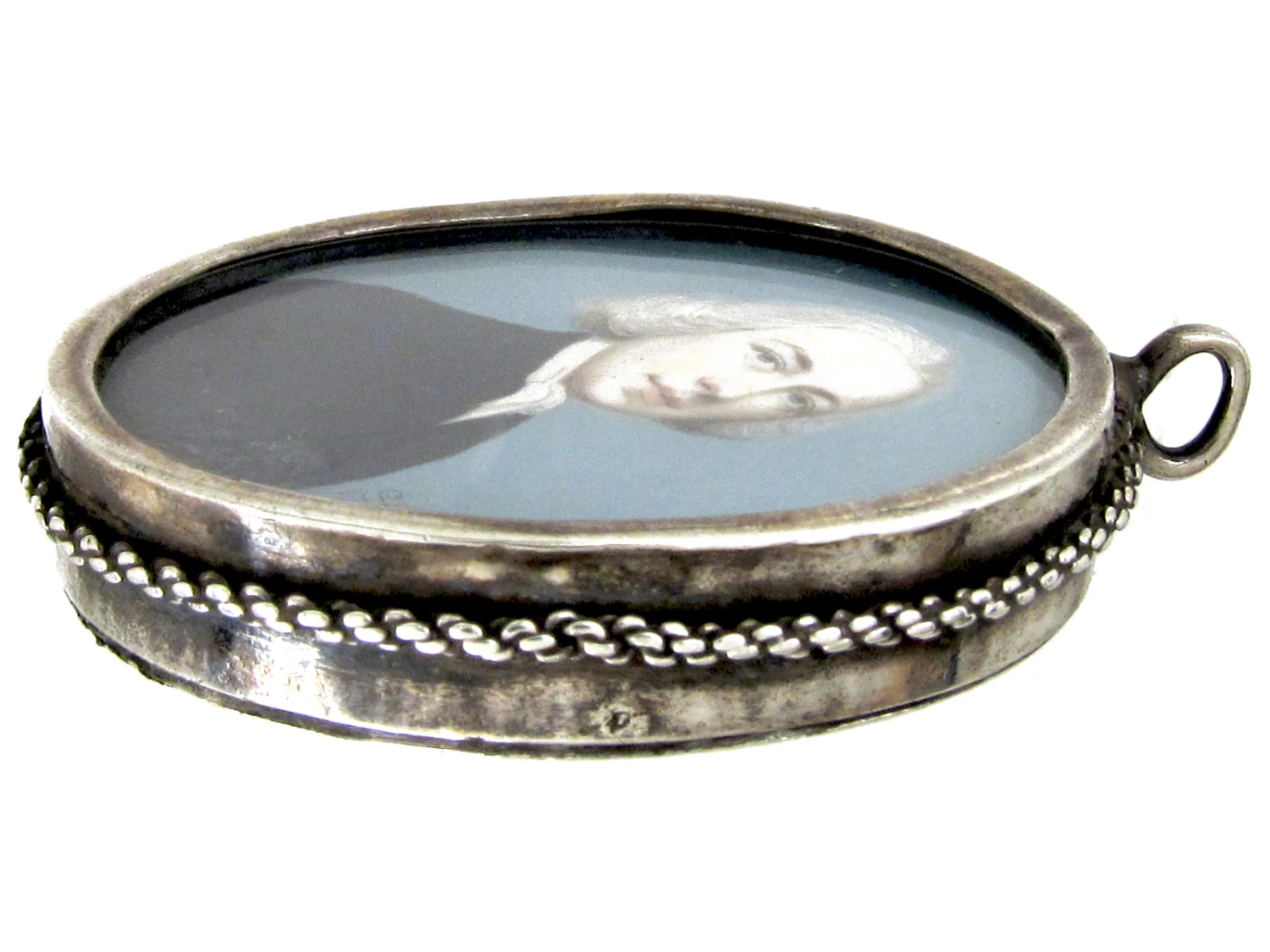 A very good quality miniature which is dated 1753 and initialed GS for Gervaise Spencer; a well known miniature portaitist in the 18th century. It is set in its original decorative silverA metallic element which is malleable and ductile, and white in colour, making it ideal for use in jewellery. It is usually mixed with copper to improve its hardness.