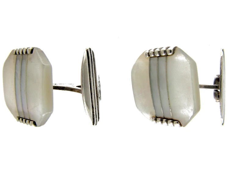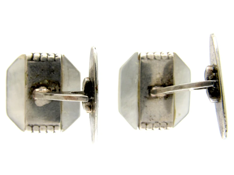 A good stylish pair of German 1940s cufflinks set with mother of pearlThe iridescent inner layer of certain molluscs such as oysters or abalones which is used as a decorative inlay. and inlaid with silverA metallic element which is malleable and ductile, and white in colour, making it ideal for use in jewellery. It is usually mixed with copper to improve its hardness.