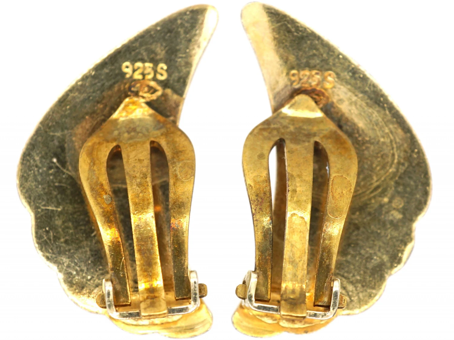 and mid blue enamelA pigmented glass-like material used in powdered form and fused onto the metal surface of a piece of jewellery. pair of earrings by Elvic & Co. The company was named after it’s founder Nils Elvik (1853-1935) Elvik & Co who were based in Oslo, Norway. They produced these enamel earrings that show the wave design beneath in the 1940-1950 period. The gilded silver edging has pretty incised decoration. This is typical of early to mid 20th century Scandinavian design. They look so stylish when worn and would make a perfect gift. We also have a necklace that matches these earrings in the Earrings section.