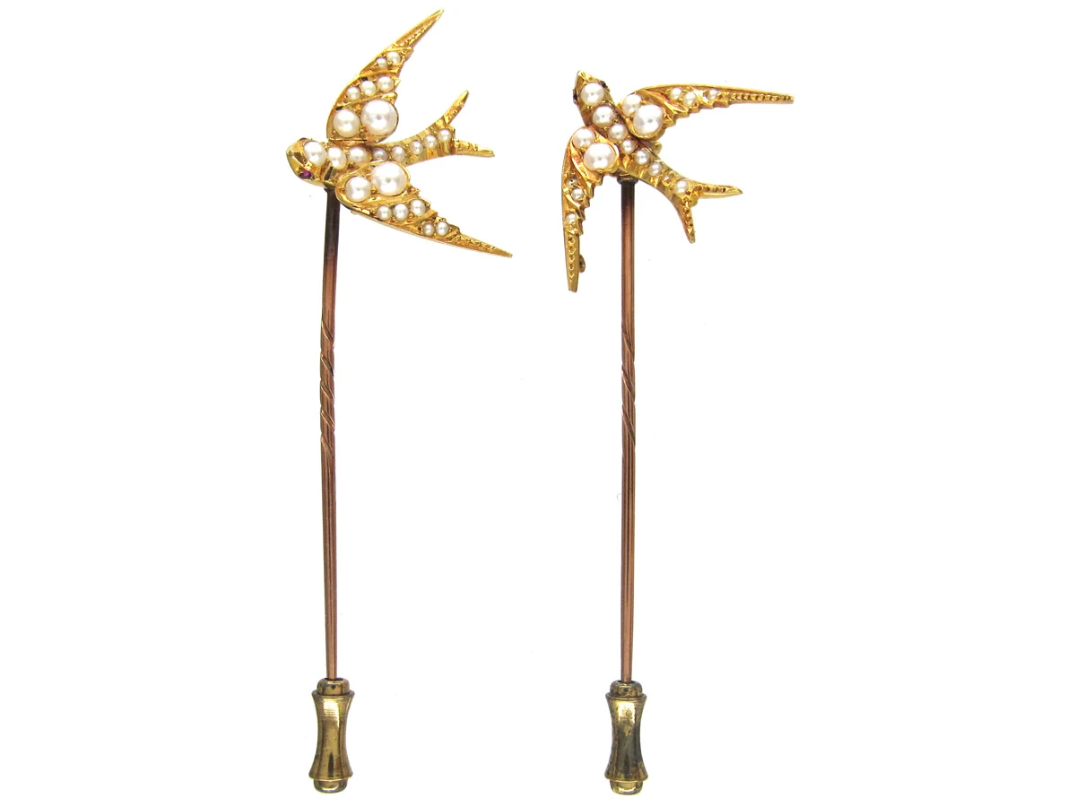 A fabulous matched pair of stickpins in their original case, manufactured by Edwards & Sons of Glasgow, jewellers to the Queen. They are 15ct62.5% pure gold (or 625 parts pure gold and 375 parts other metals). Popular during the Victorian, Edwardian and Art Deco eras but was discontinued in the mid-1930s. gold and set with beautiful, white matched naturalA natural stone is called such because it has not been subjected to any treatments. split pearls and tiny cabochonA polished, not faceted, dome shaped stone – either round or oval with a flat polished base, primarily used as a cut for phenomenal stones such as cat’s eyes and stars.