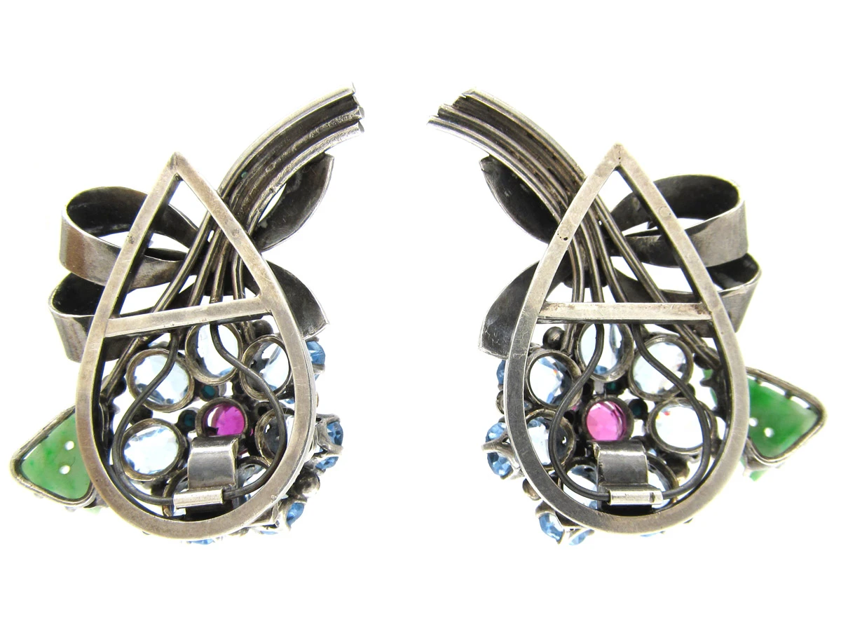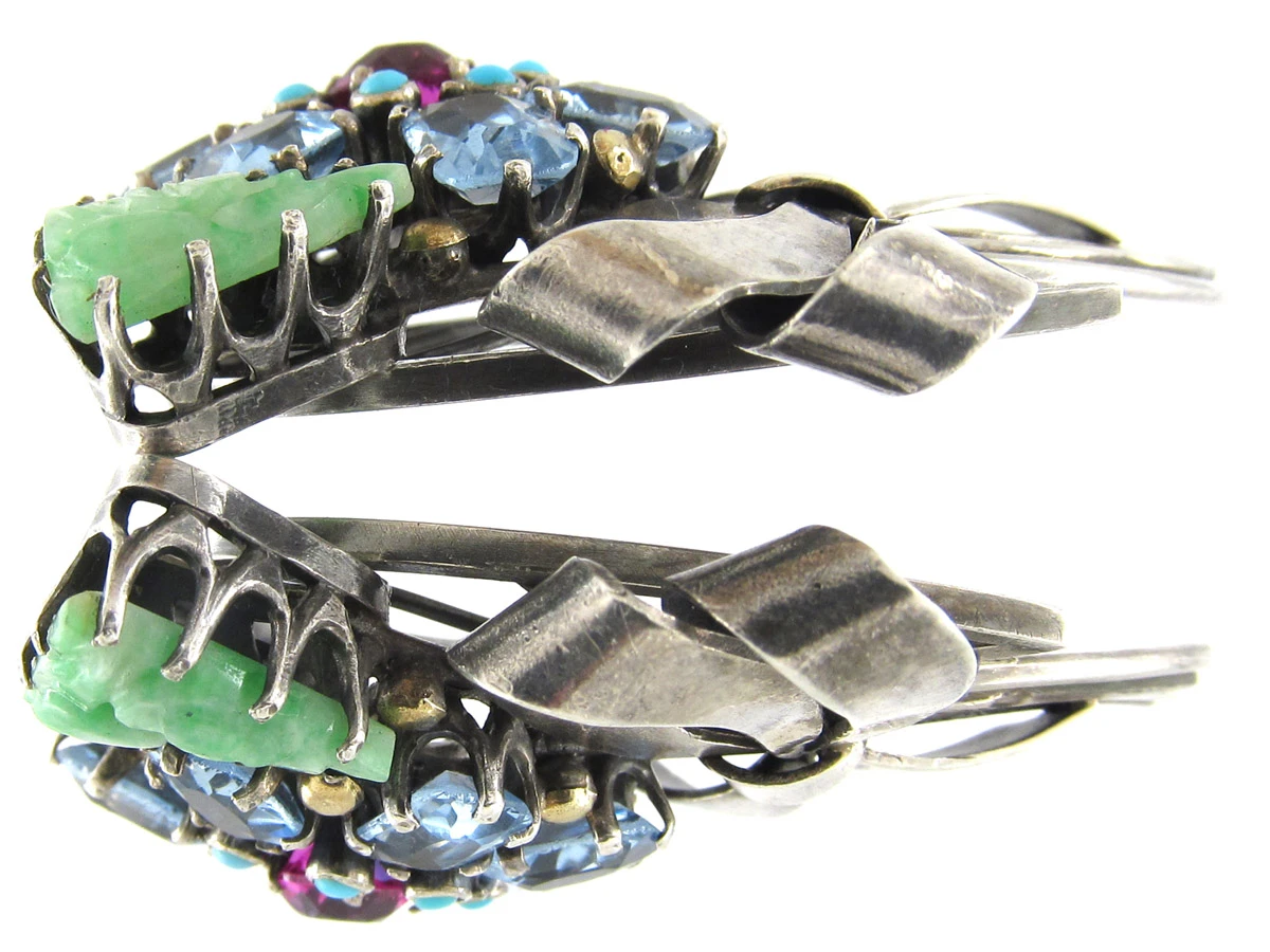 An unusual and eye catching pair of jadeA semi-precious stone that ranges in colour. Translucent jade is more highly valued than opaque jade. Jade is often cabochon cut. Stones with imperfections are usually carved. Two different minerals are known as jade: jadeite and nephrite. The Chinese have prized jade for thousands of years and regard it as having medicinal properties when worn or ingested a…, aquamarineAquamarine (from the Latin, “water from the sea”) is a blue variety of the mineral, beryl, of which emerald is the less durable but more prized green variety. Aquamarine was believed to protect sailors at sea and banish fear., turquoiseTurquoise is an opaque gem and is often formed in what is called matrix, a black or brown veining derived from the host rock in which the gem forms. In fine jewellery, unblemished sky blue turquoise is the ideal, although regularly patterned matrix turquoise is also sought-after. and rubyOne of the most valuable gemstones on earth. From the corundum family, the red variety being ruby and the blue, sapphire. With the exception of the diamond, corundum is the hardest of the gemstones on the Mohs scale scoring a 9. clips. Fantastic on lapels or on a starched white collar.