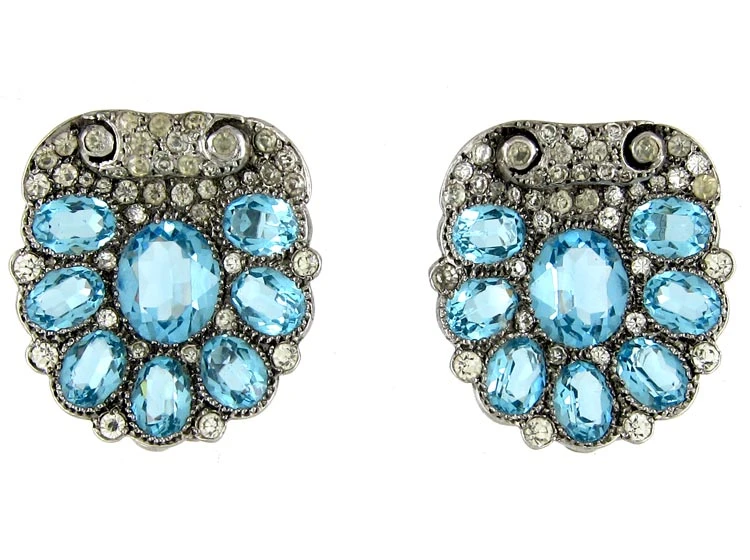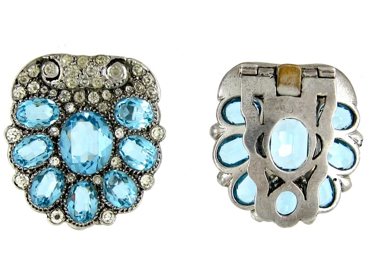 A striking pair of Art DecoA movement within the arts between the two Great Wars (1920-1935) across Europe and the US, characterized by its clean, geometric designs. The aesthetic was intended to celebrate an age of progress and the modernity of the machine. blue and white pasteGlass made to resemble gem materials, which may be moulded, faceted, carved, etc. clips. They are shell shape, and unusual.
